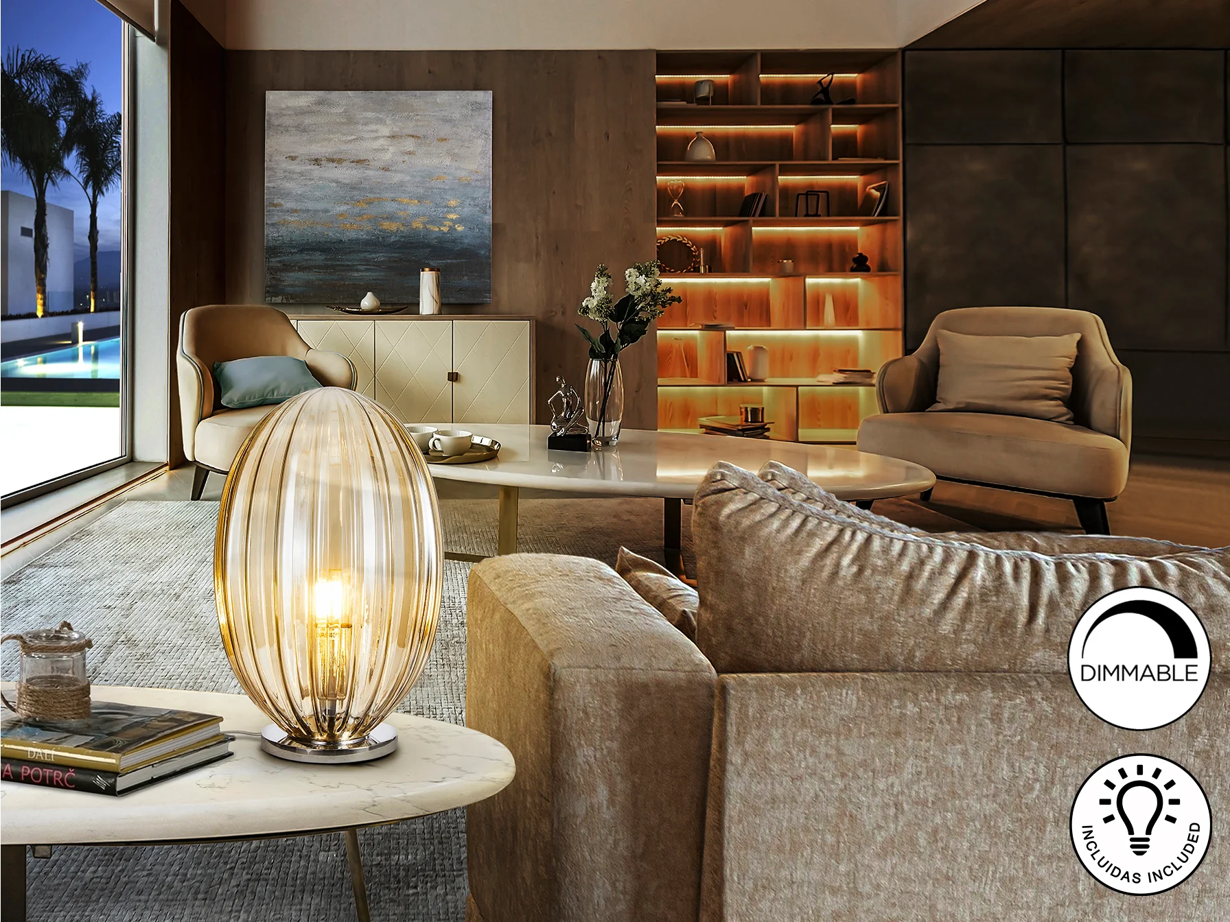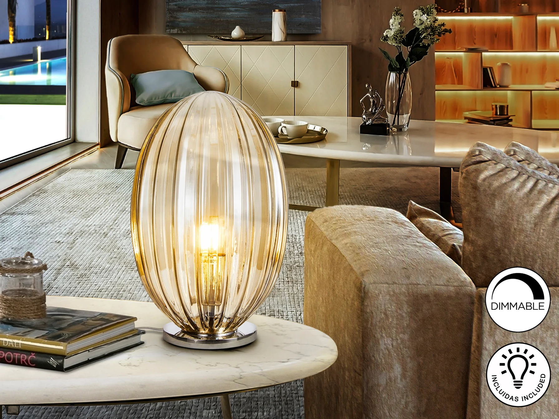 La lámpara Ovila combina la robustez del metal cromado con la delicadeza del cristal color coñac. Esta combinación de materiales crea un efecto visual atractivo y proporciona una luz cálida y difusa, ideal para crear ambientes relajantes. Su diseño compacto la hace perfecta para colocar en mesas auxiliares, mesitas de noche o escritorios.