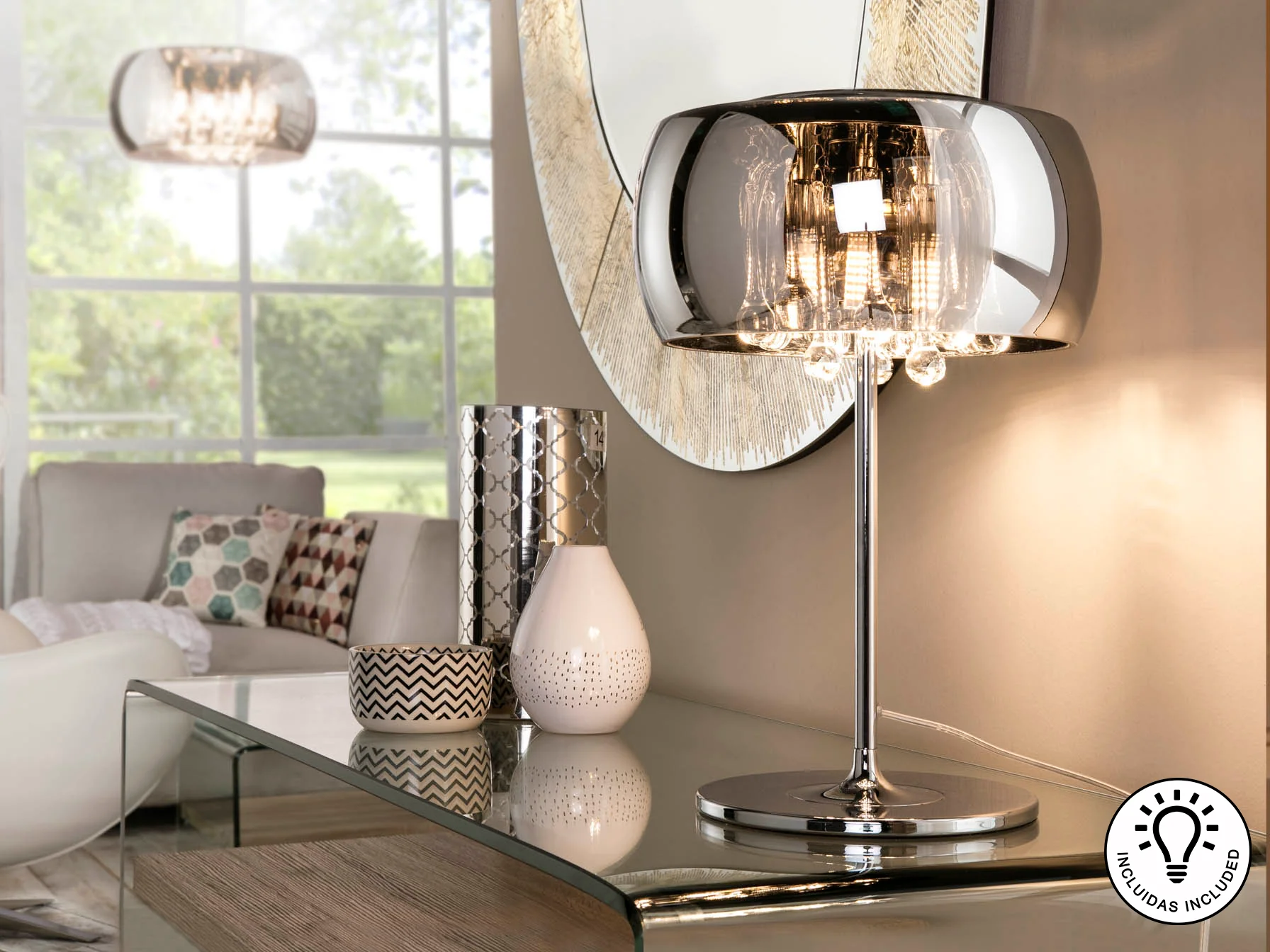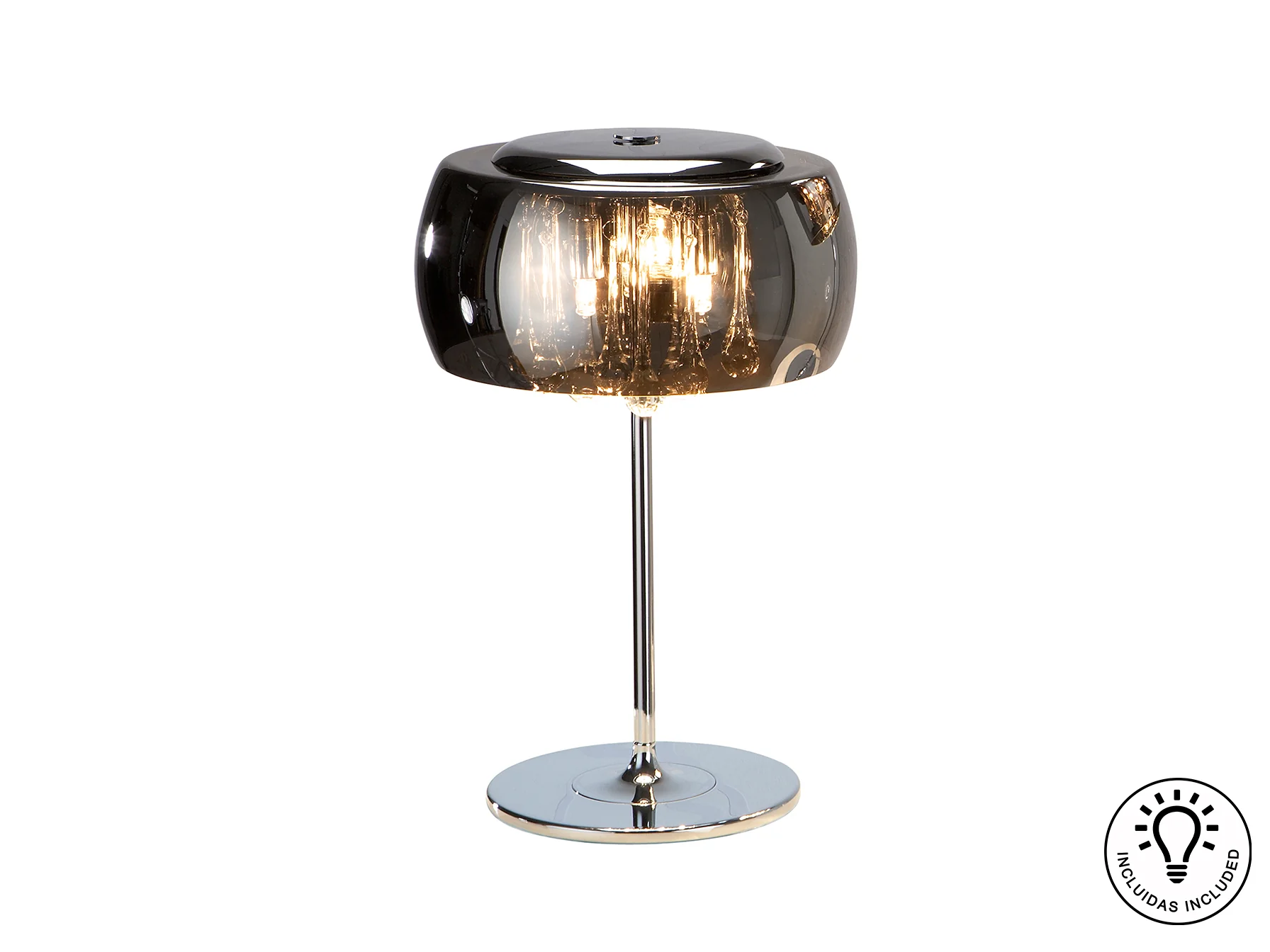 Esta lámpara de sobremesa se coloca fácilmente en cualquier superficie plana. Para mantener su brillo, limpie regularmente con un paño suave y seco. Evite el uso de productos abrasivos que puedan dañar el acabado cromado o el cristal.