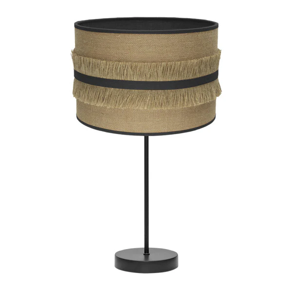 Lámpara sobremesa Natalia Grande. Esta pieza de la serie Natalia transforma cualquier rincón en un oasis de calidez y estilo, con su pantalla cilíndrica en tela de saco y lino rayado negro que difunde una luz suave y acogedora. No solo decora, sino que resuelve la necesidad de iluminación ambiental en espacios reducidos, permitiendo crear atmósferas íntimas sin esfuerzo. Imagina iluminar tu dormitorio con un toque vintage o realzar el salón en una noche acogedora, combinando rústico y moderno con precisión. Su diseño con flecos y pasamanería añade un detalle único que eleva la decoración. Descubre la calidad de Abrila, disponible en LUZGURU para un hogar lleno de encanto.