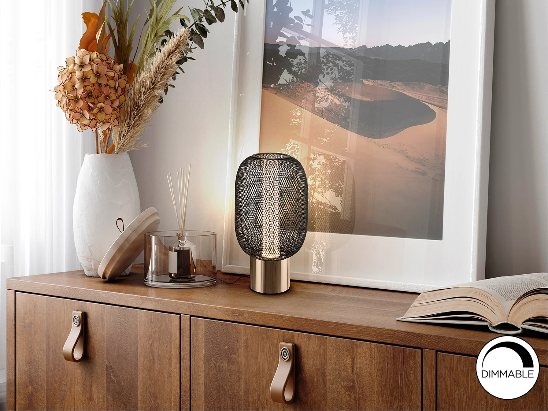 La lámpara de sobremesa Micrón de Schuller redefine la iluminación ambiental. Su diseño en oro y negro, combinado con la luz cálida de 3000K, crea una atmósfera acogedora y elegante en cualquier estancia. Perfecta para salones, dormitorios o despachos, Micrón no solo ilumina, sino que añade un toque de distinción y modernidad a tu hogar. Disfruta de un ambiente relajante y con estilo gracias a esta pieza única.