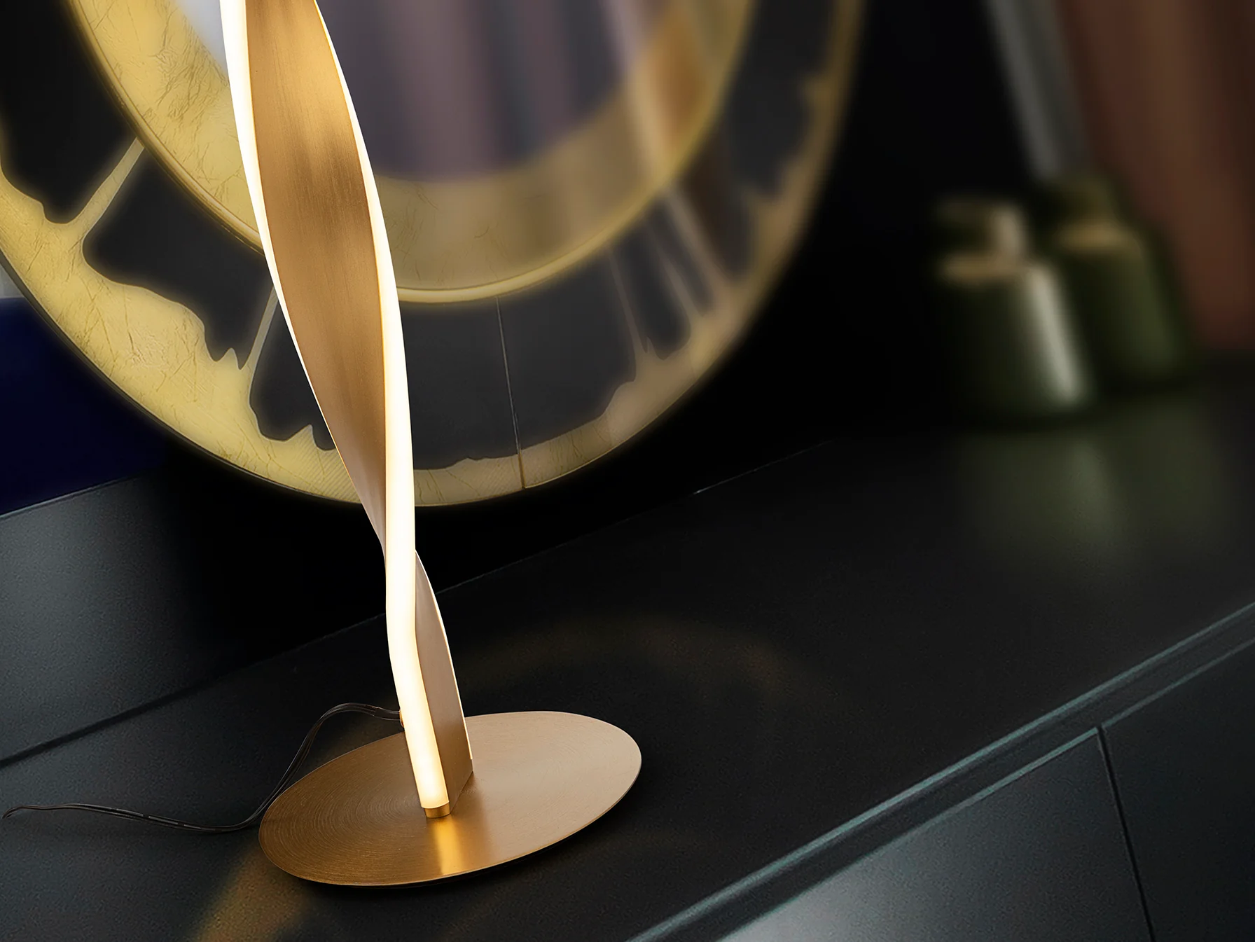 La lámpara Twist combina la robustez del metal con la suavidad del difusor de silicona opal, creando una luz uniforme y sin deslumbramientos. Su acabado en oro cepillado aporta un toque de lujo discreto, mientras que su diseño en espiral añade un elemento visual dinámico y moderno. Ideal para crear ambientes cálidos y acogedores.