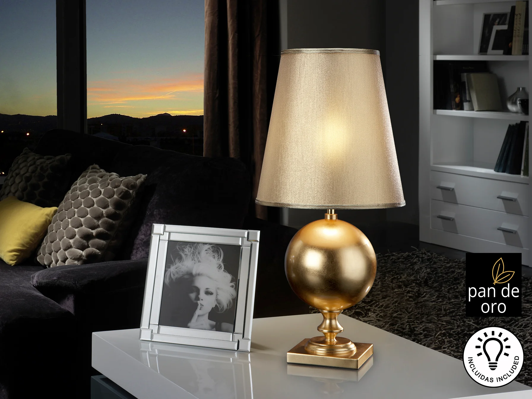 Esta lámpara de sobremesa está diseñada para ser colocada en cualquier superficie plana. Para mantener su brillo y elegancia, se recomienda limpiar suavemente con un paño seco. Evitar el uso de productos abrasivos que puedan dañar el acabado en pan de oro.