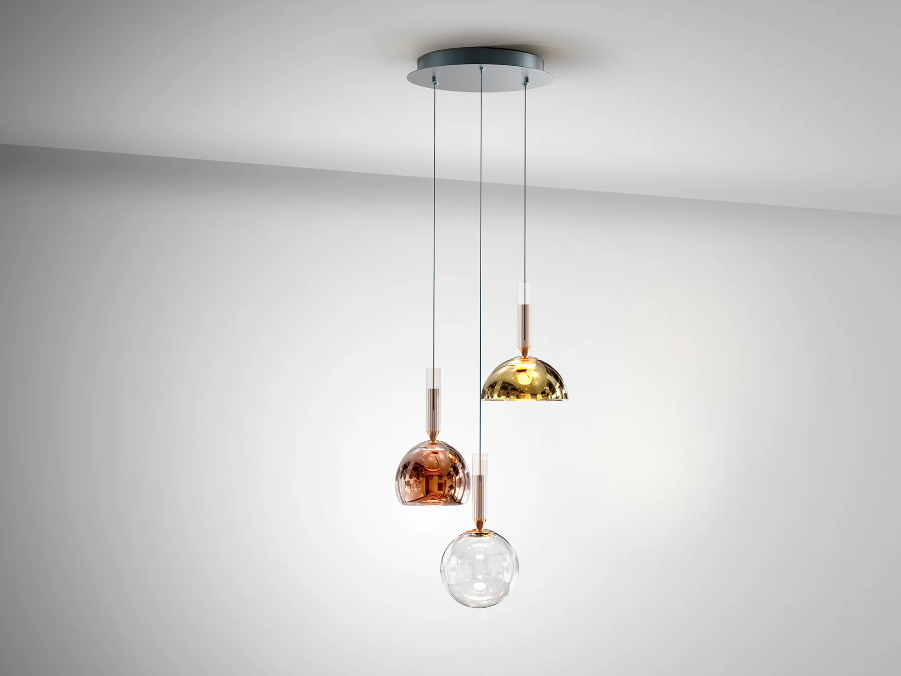 La Charlize destaca por su construcción en aluminio cepillado con acabado en gris oscuro, que le confiere un aspecto elegante y contemporáneo. Las tulipas de cristal espejado, con baño electrolítico en tonos cobre, dorado y cristal transparente, ofrecen una iluminación suave y difusa gracias a su luz LED integrada y difusor de acrílico opal. Esta combinación de materiales y diseño asegura una iluminación de alta calidad y un ambiente agradable.