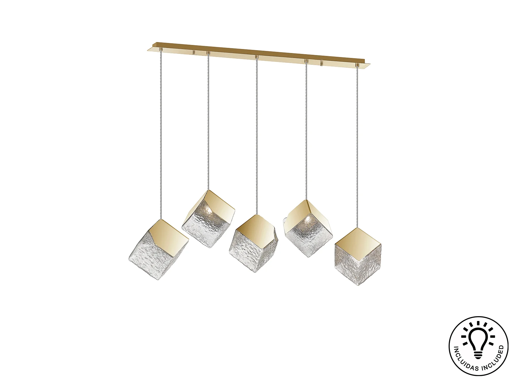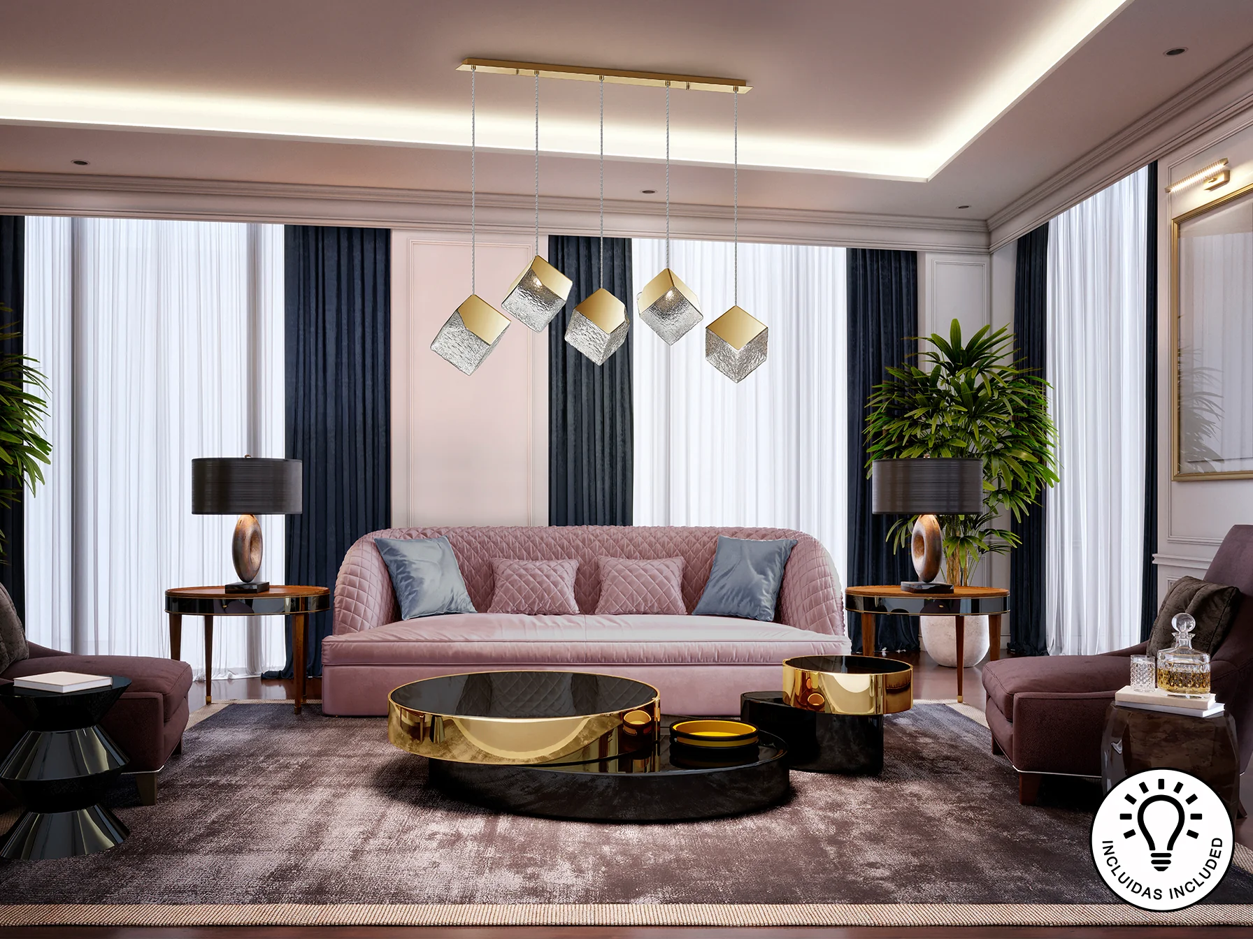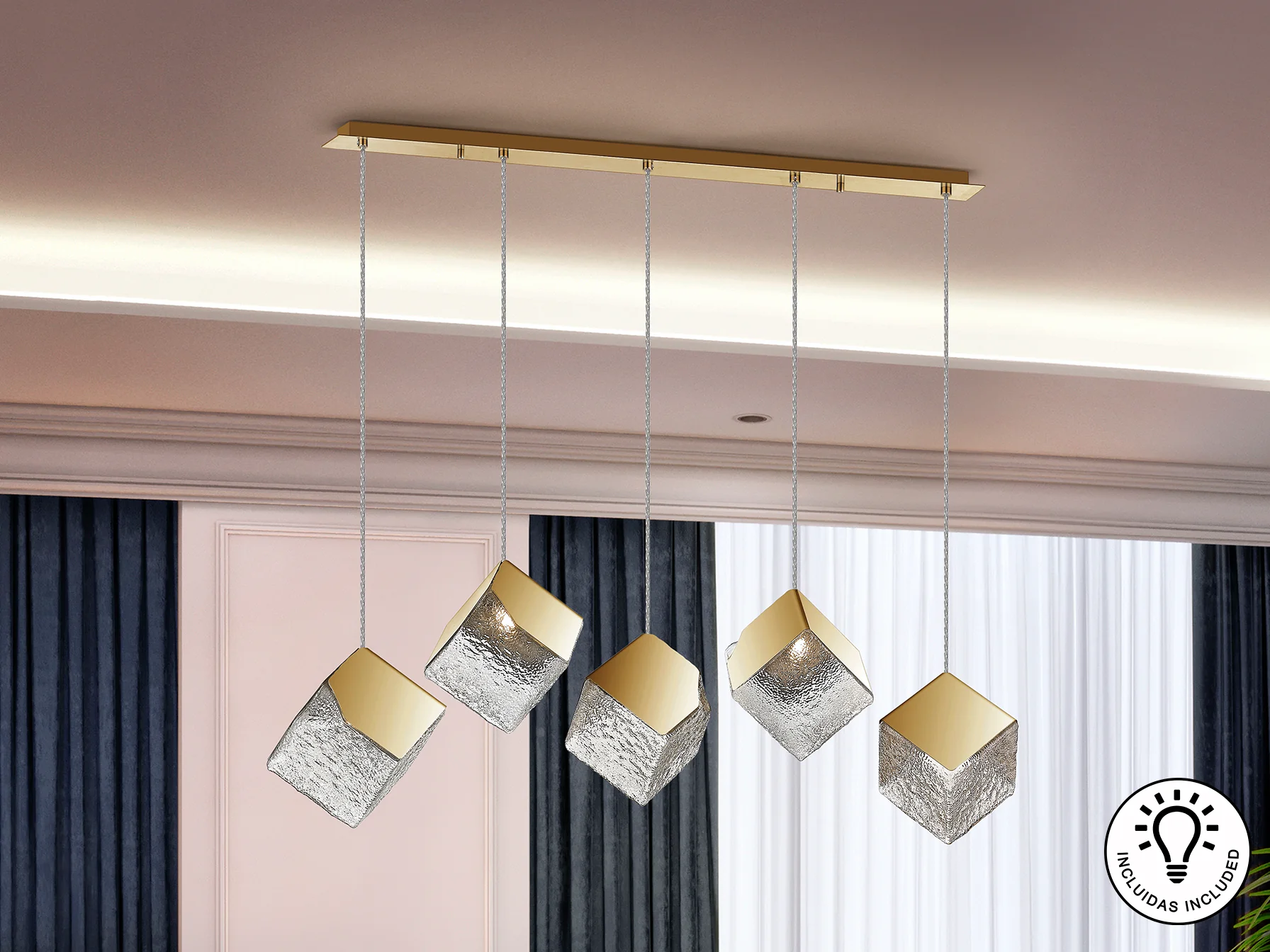 La lámpara Priscila destaca por su construcción en metal y acero, garantizando durabilidad y un acabado impecable en oro texturizado. Las tulipas cúbicas de cristal texturizado difuminan la luz de manera uniforme, creando un ambiente agradable y sin deslumbramientos. Su diseño moderno la convierte en una pieza central que complementa cualquier estilo decorativo.