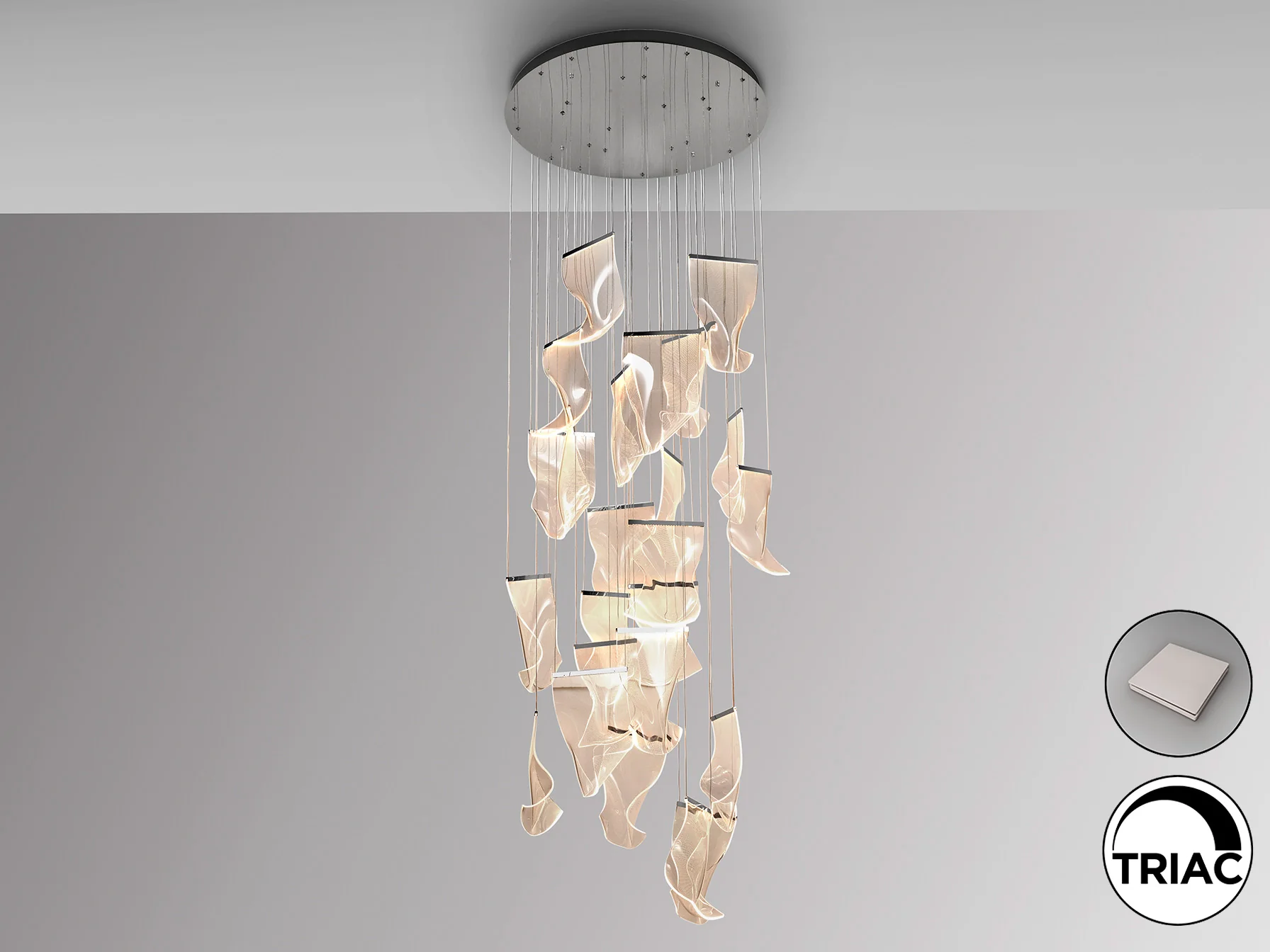 La lámpara Velos destaca por su estructura de metal cromado y tulipas de metacrilato microimpreso, una combinación que difunde la luz de manera uniforme y crea un ambiente acogedor. Su iluminación LED integrada ofrece una luz cálida y potente, ideal para salones y comedores. La posibilidad de regular la intensidad lumínica permite adaptar la atmósfera a cada ocasión, desde una cena íntima hasta una reunión familiar.