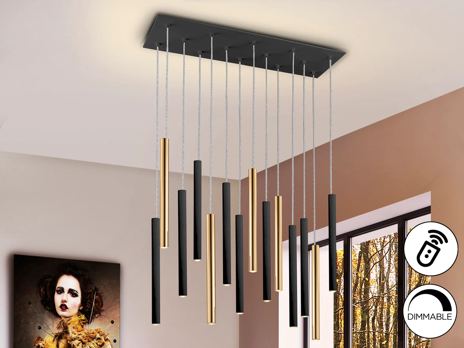 La lámpara de techo Varas de Schuller redefine la iluminación interior, fusionando el lujo del oro con la sobriedad del negro en un diseño de varas que captura la atención. Perfecta para salones y comedores que buscan un toque distintivo, esta lámpara LED no solo ilumina, sino que también decora, creando un ambiente acogedor y sofisticado. Su luz dimmable te permite ajustar la intensidad para cada ocasión, desde cenas íntimas hasta reuniones familiares.