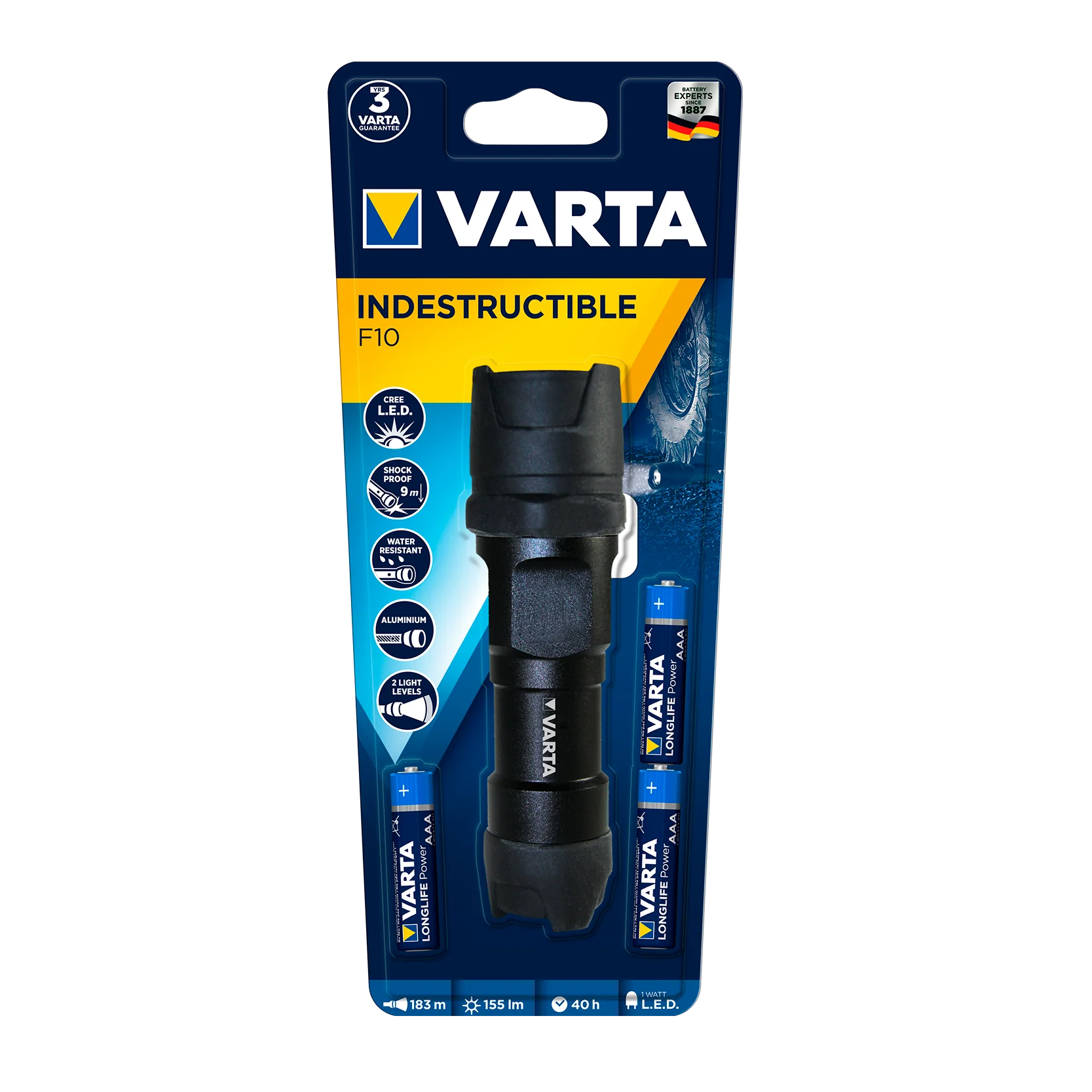 La Linterna VARTA Indestructible F10 ofrece una potencia de 1W y dos modos de funcionamiento: 120 lúmenes para máxima iluminación y 19 lúmenes para ahorrar energía. Su diseño robusto, con cabezal y base roscada recubiertos de caucho, la convierte en una herramienta imprescindible para cualquier situación. Incluye pilas AAA (LR03).