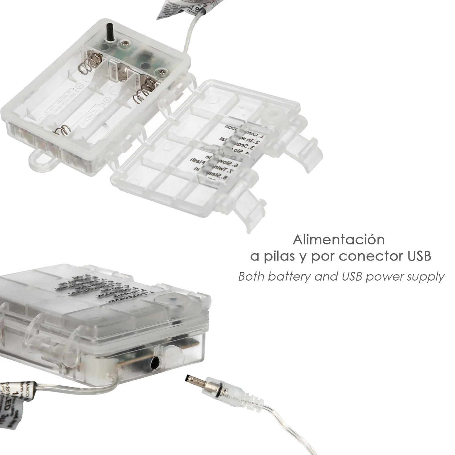 Luces Navidad 100 Microleds Blanco Frio, Cable Color Cobre Funcionamiento A Bateria (3 AA No incluidas) o Con Cable USB. IP44