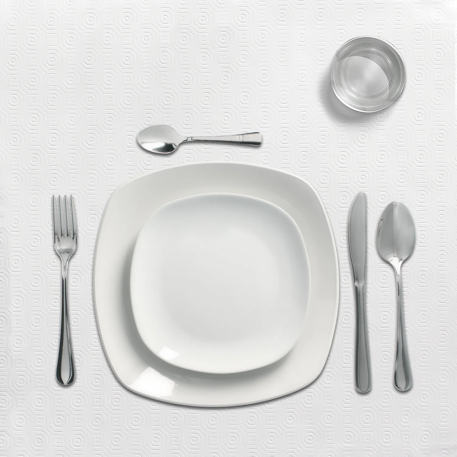 – Mantel Hule Muletón en color blanco y estampado en formas geométricas. Diseño moderno y elegante para cualquier ocasión.
