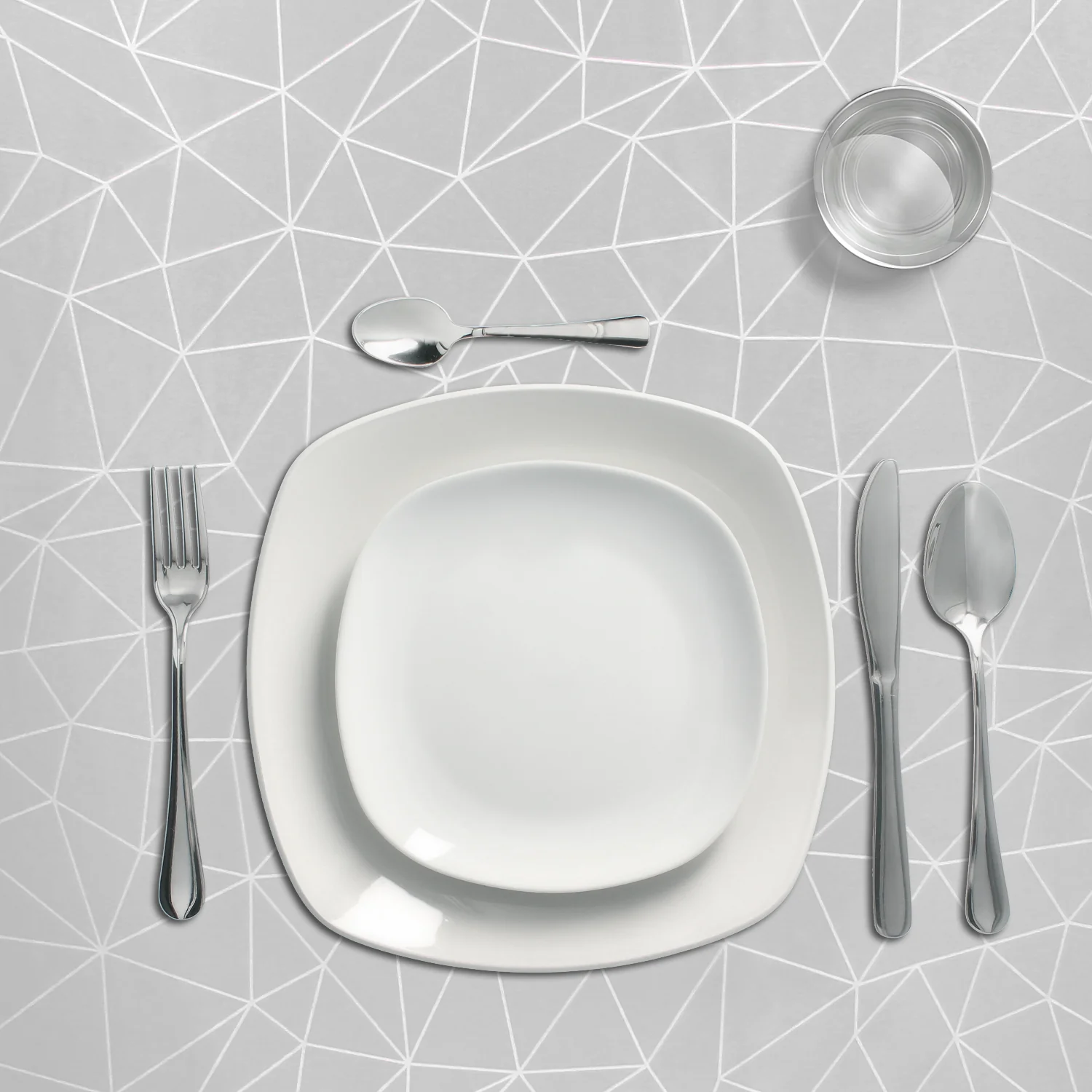 - Mantel Hule estampado en color gris con formas geométricas blancas. Diseño moderno y elegante para cualquier ocasión