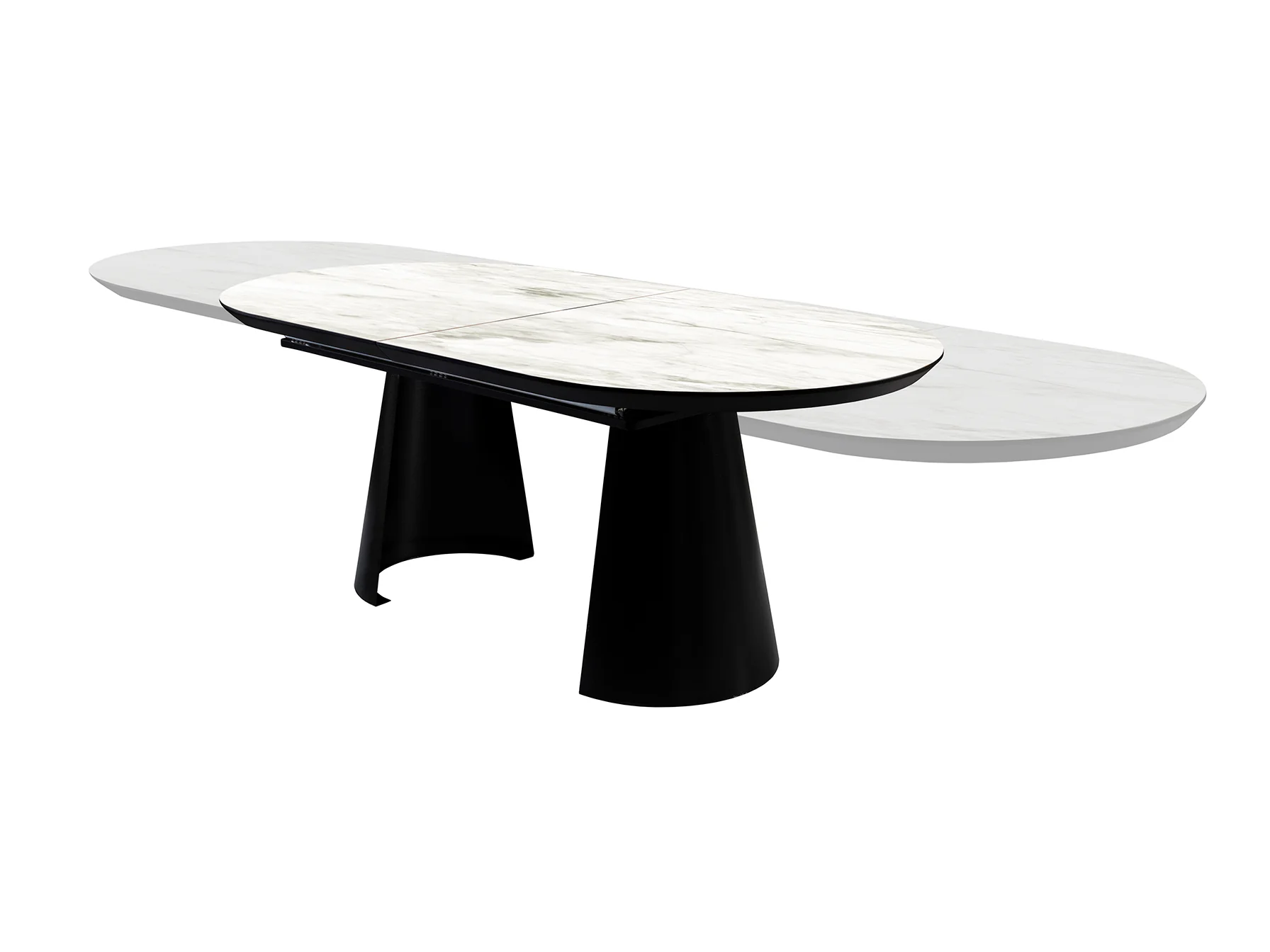 La mesa Capri combina la robustez del metal con la elegancia del mármol blanco. Su tapa de DM con superficie melamínica de alta resistencia asegura durabilidad y fácil limpieza, mientras que su extensión de hasta 4 metros la convierte en la anfitriona perfecta para cualquier ocasión. El acabado en negro mate añade un toque de sofisticación que complementa cualquier decoración.