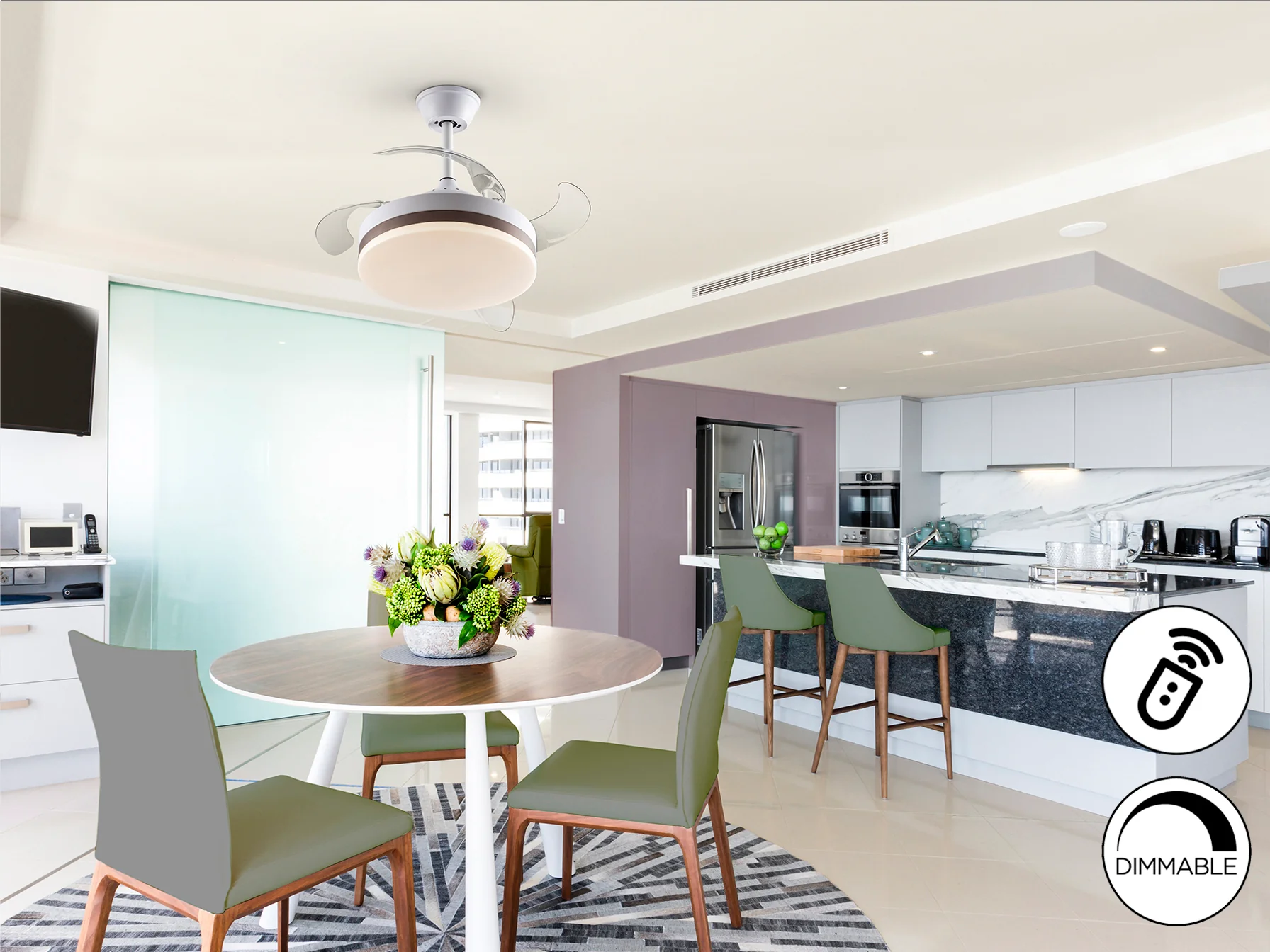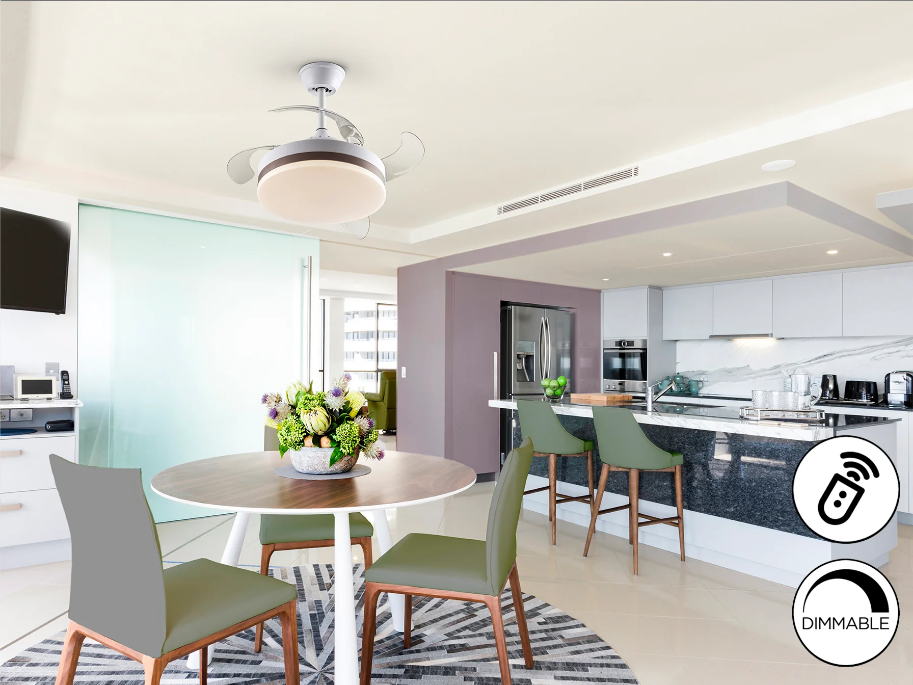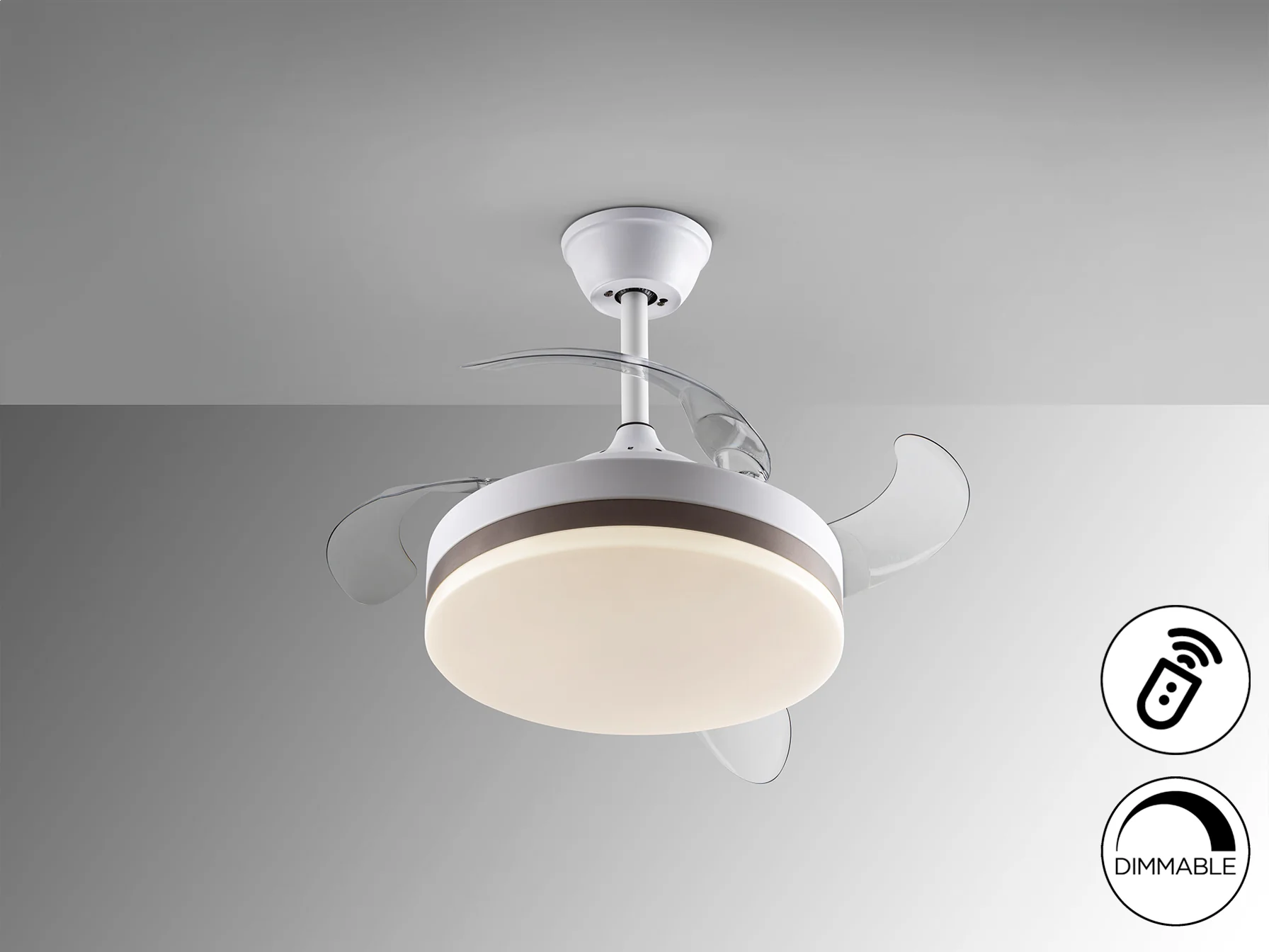 El Vento Mini-Ventilador combina la funcionalidad de un ventilador de techo con la estética de una lámpara moderna. Sus aspas escamoteables, fabricadas en acrílico transparente, se despliegan suavemente para proporcionar una ventilación eficiente y silenciosa. El motor DC de bajo consumo te permite disfrutar de un ambiente fresco sin preocuparte por el gasto energético. Además, la luz LED dimmable con temperatura de color regulable te ofrece un control total sobre la iluminación de tu espacio.