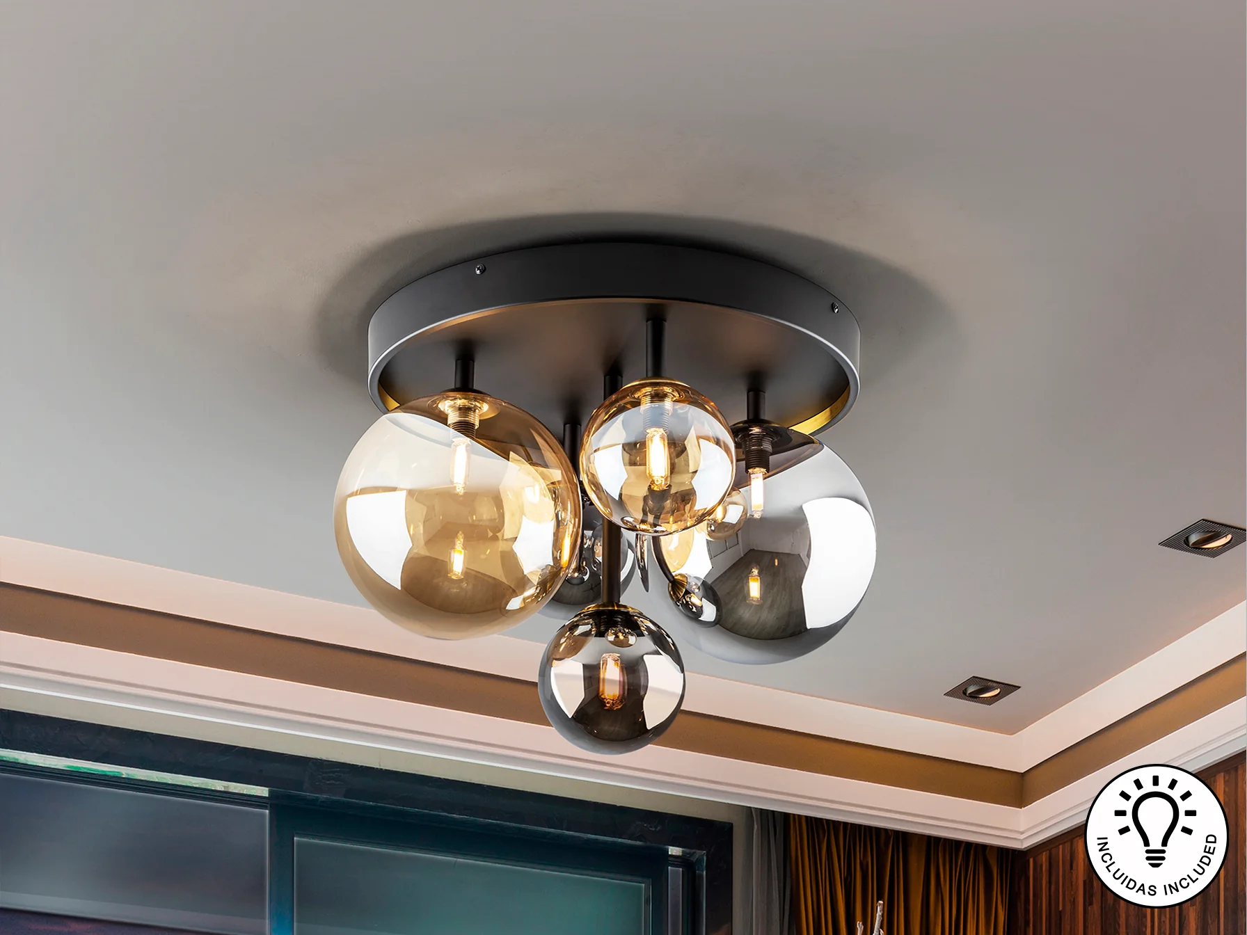 El plafón Dark destaca por su estructura de metal con acabado negro mate y detalles en latón satinado, que le confieren un aspecto moderno y elegante. Las tulipas de cristal esféricas, en dos tamaños y acabados (ámbar y gris smoke espejado), difunden la luz de manera uniforme, creando un ambiente cálido y acogedor. La combinación de materiales de alta calidad garantiza la durabilidad y resistencia del producto.