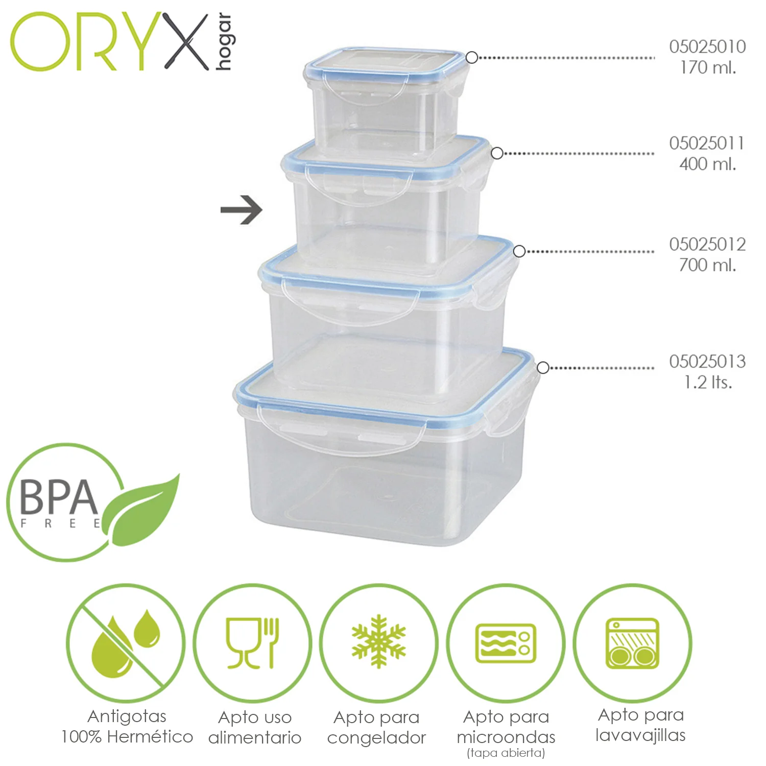 - Recipientes herméticos para una mejor conservación y un transporte sin derrames. Las tapas cuentan con un sistema de 4 cierres de bloqueo además están realizado en silicona inyectada que se adhiere al recipiente aislando los alimentos de gérmenes y olores externos y favoreciendo su perfecta conservación