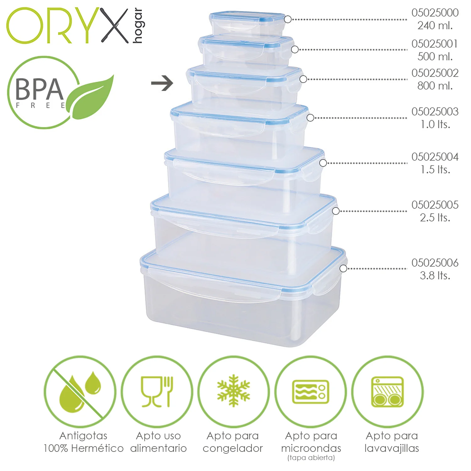 - Recipientes herméticos para una mejor conservación y un transporte sin derrames. Las tapas cuentan con un sistema de 4 cierres de bloqueo además están realizado en silicona inyectada que se adhiere al recipiente aislando los alimentos de gérmenes y olores externos y favoreciendo su perfecta conservación