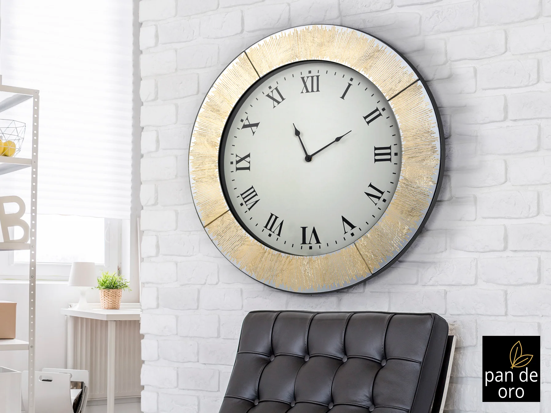 Debido a su tamaño y peso, se recomienda asegurar el reloj a la pared con un sistema de anclaje adecuado para garantizar su estabilidad y seguridad. Para mantener su brillo y belleza, límpielo regularmente con un paño suave y seco. Evite el uso de productos químicos agresivos que puedan dañar el espejo o el pan de oro.