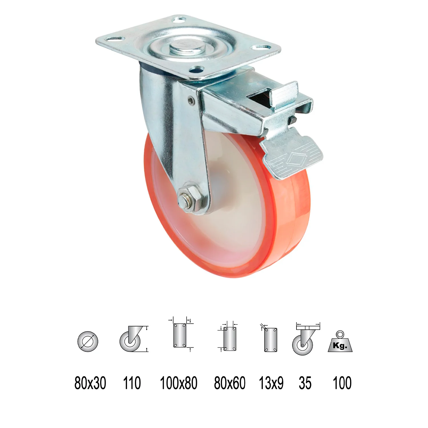Rueda Industrial Poliuretano Placa con freno 80 mm.