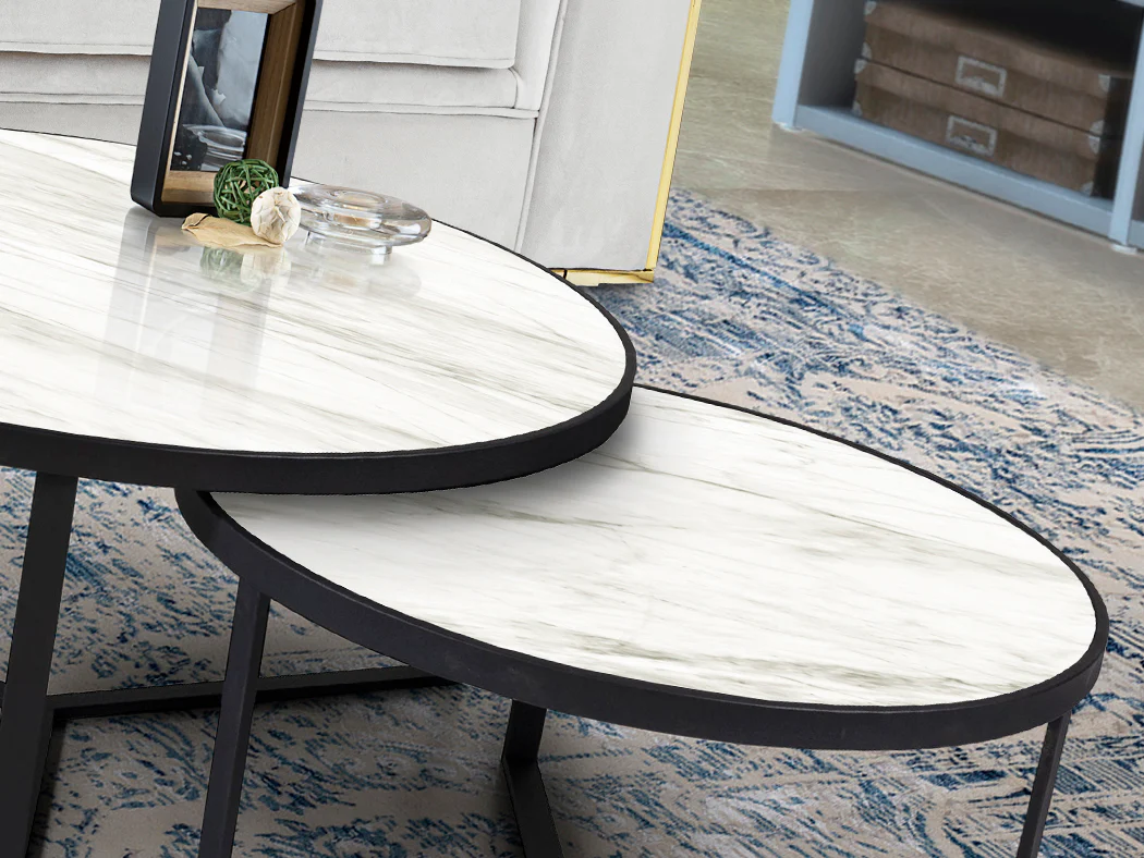 La estructura de metal garantiza durabilidad y estabilidad, mientras que la superficie de DM con acabado melamínico imitación mármol blanco ofrece una resistencia superior al uso diario. Su diseño permite utilizarlas juntas o por separado, adaptándose a diferentes configuraciones y necesidades de espacio. La altura de las mesas está pensada para ofrecer la máxima comodidad al usarlas como apoyo para bebidas, libros o dispositivos electrónicos.