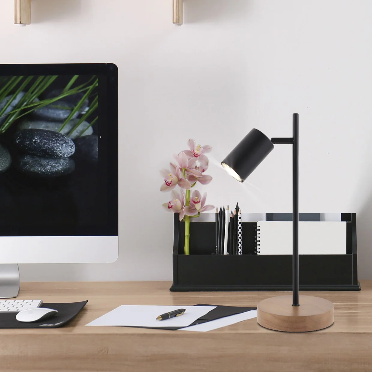 Está fabricada en metal con acabado en negro y base de madera de roble.