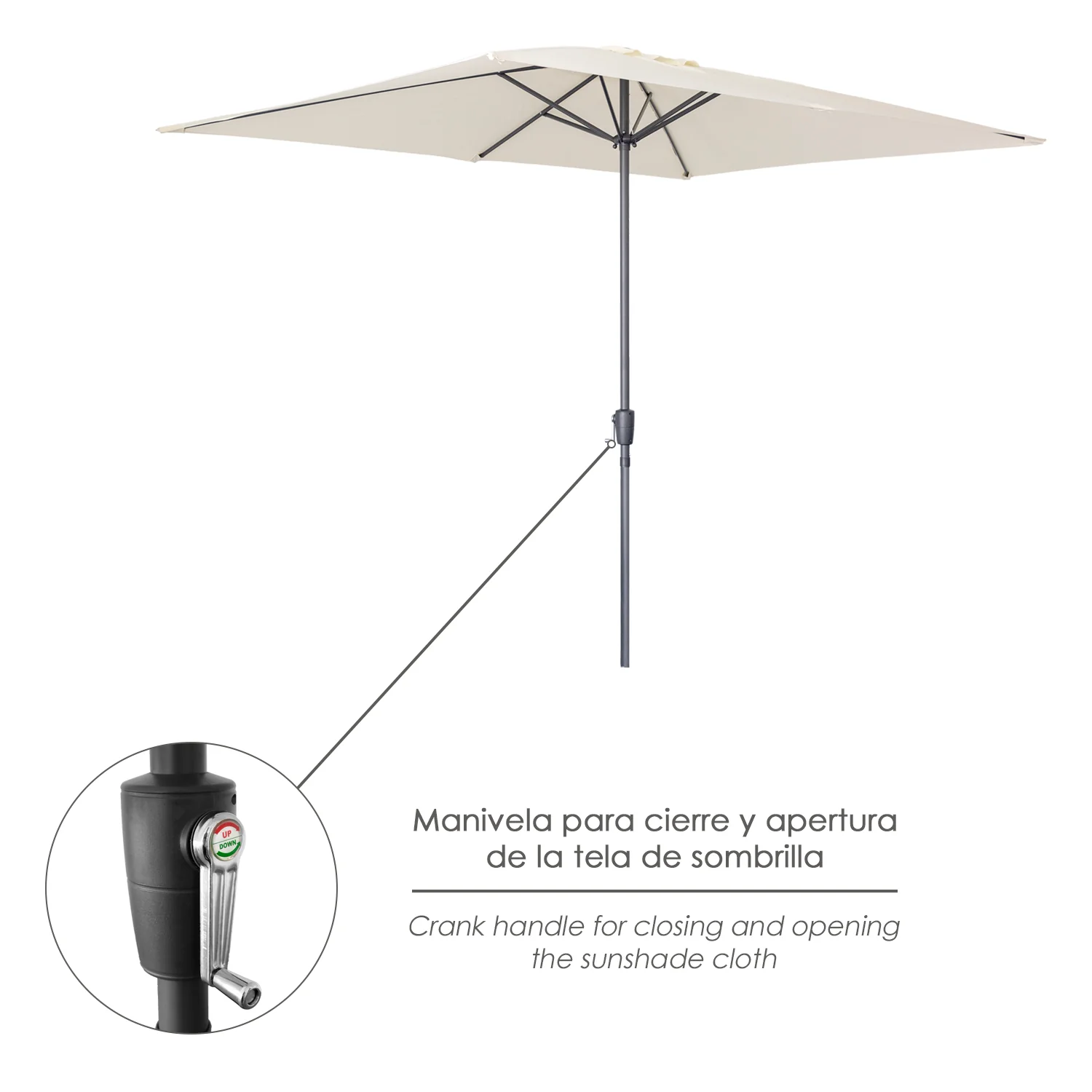 – Manivela antiretorno que facilia la apertura y el cierre de la sombrilla.