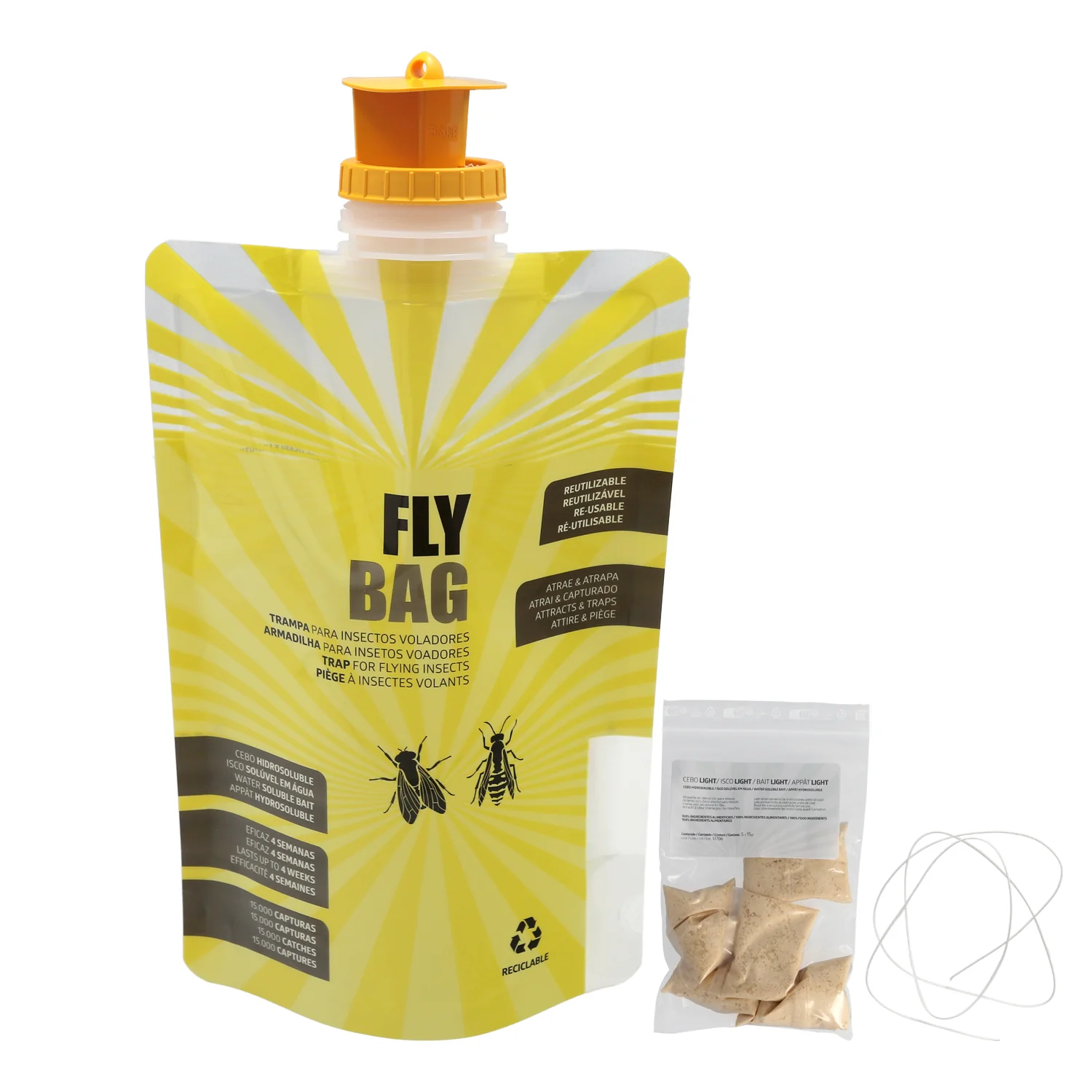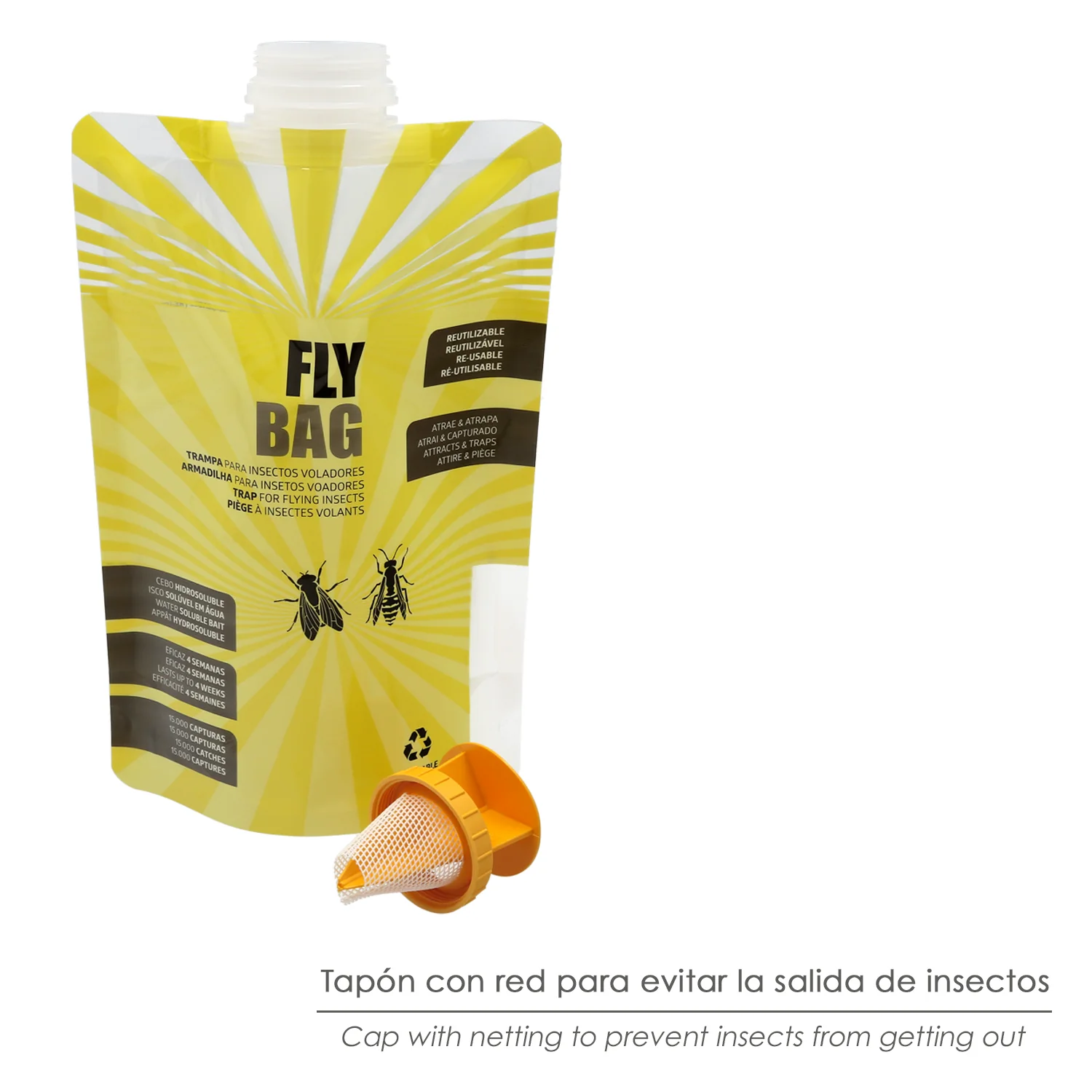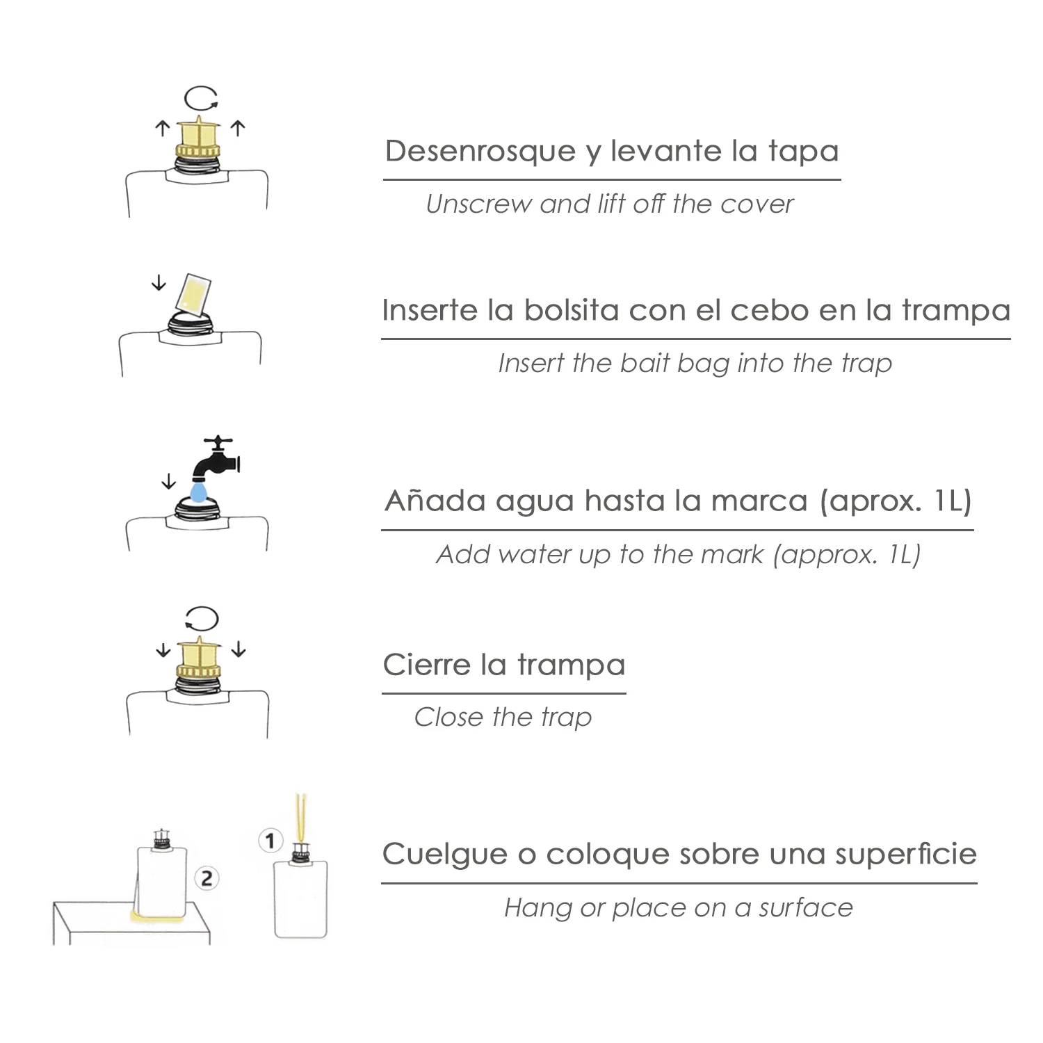 - Sistema fácil para limitar la presencia de moscas en el jardín. Coloque un sobre con el cebo alimentario en la trampa y añada un litro de agua. Enrosque la tapa