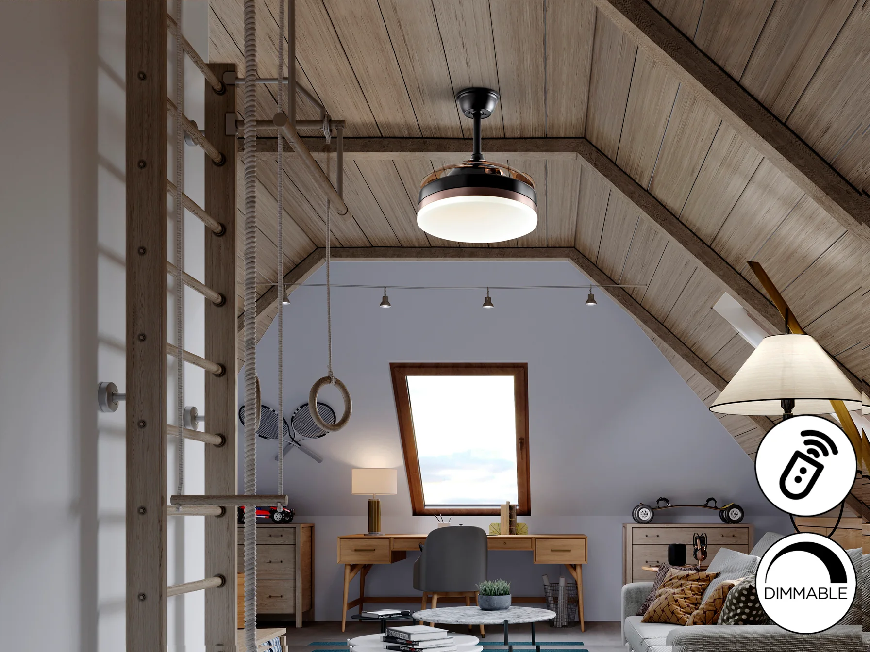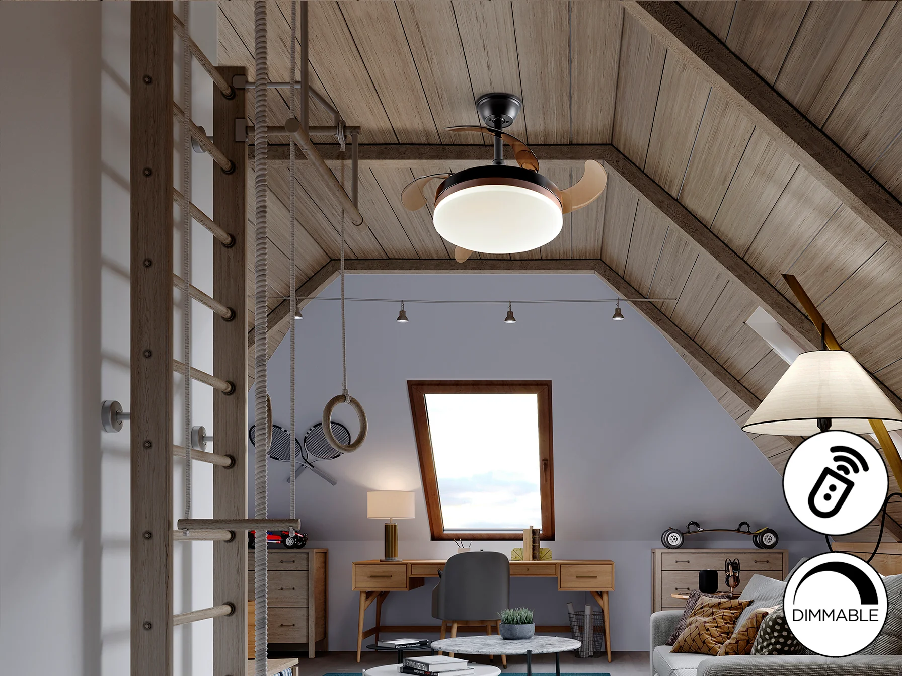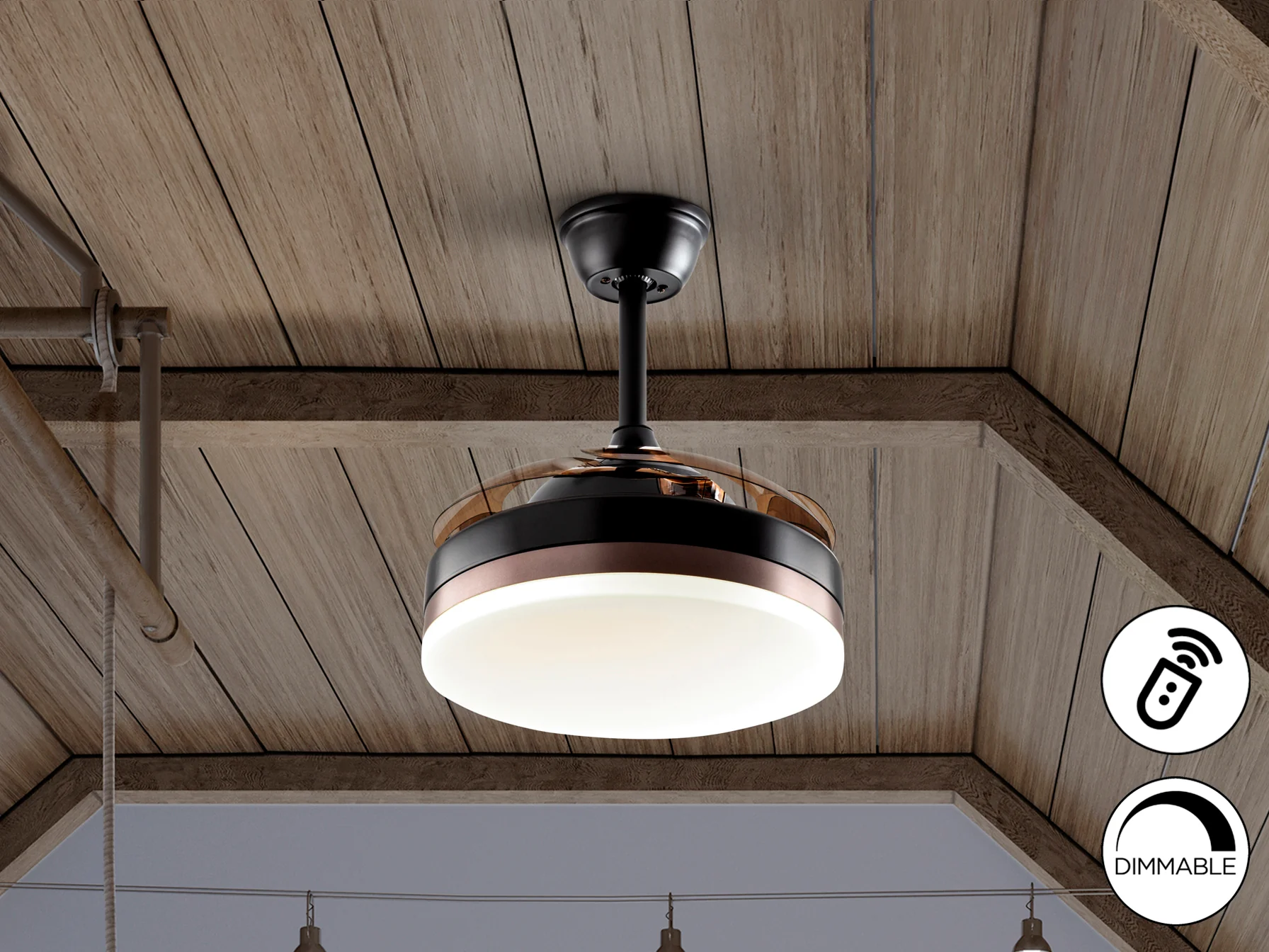 - Diseño 2 en 1: Ventilador y lámpara de techo en un solo dispositivo.