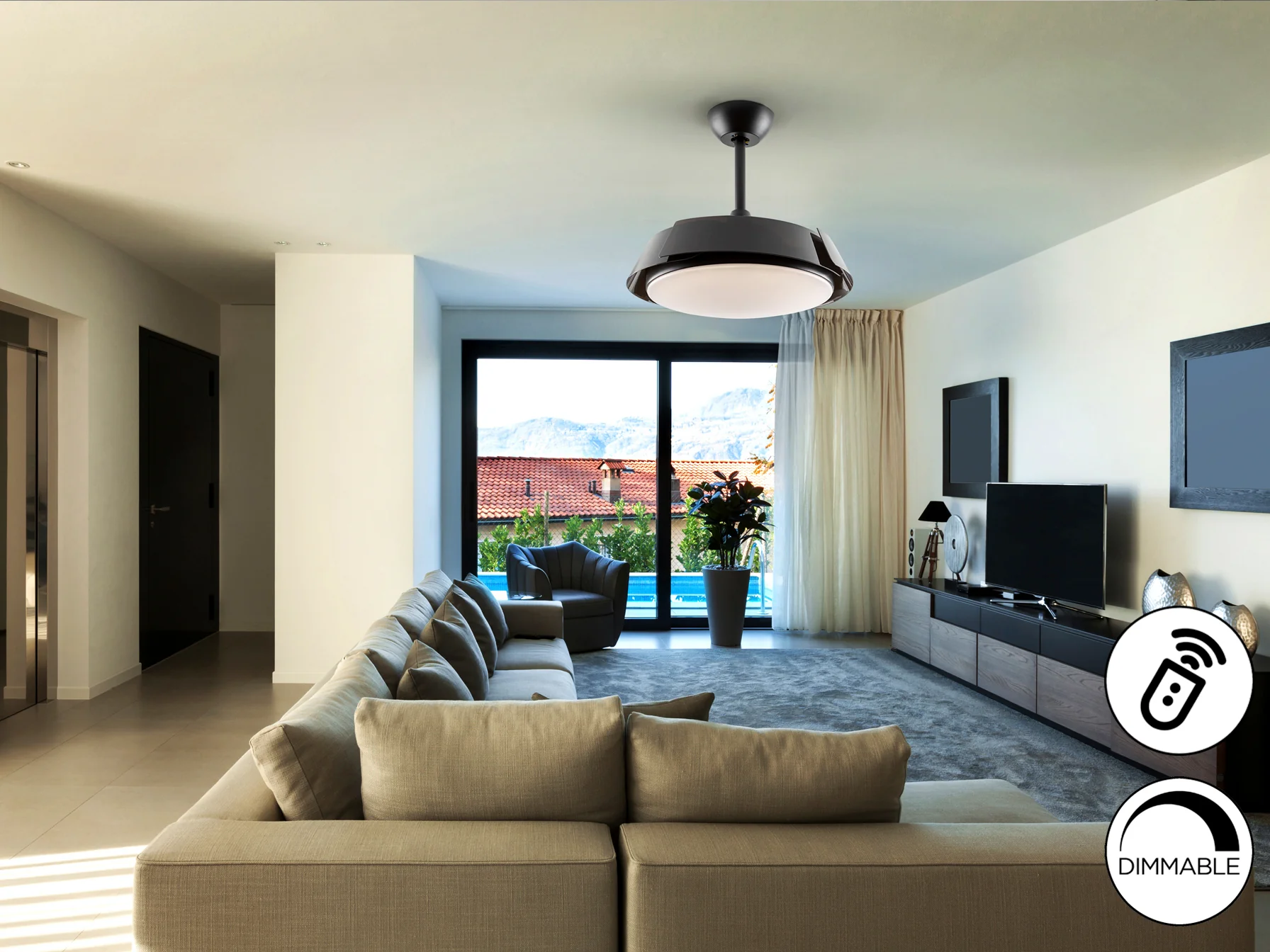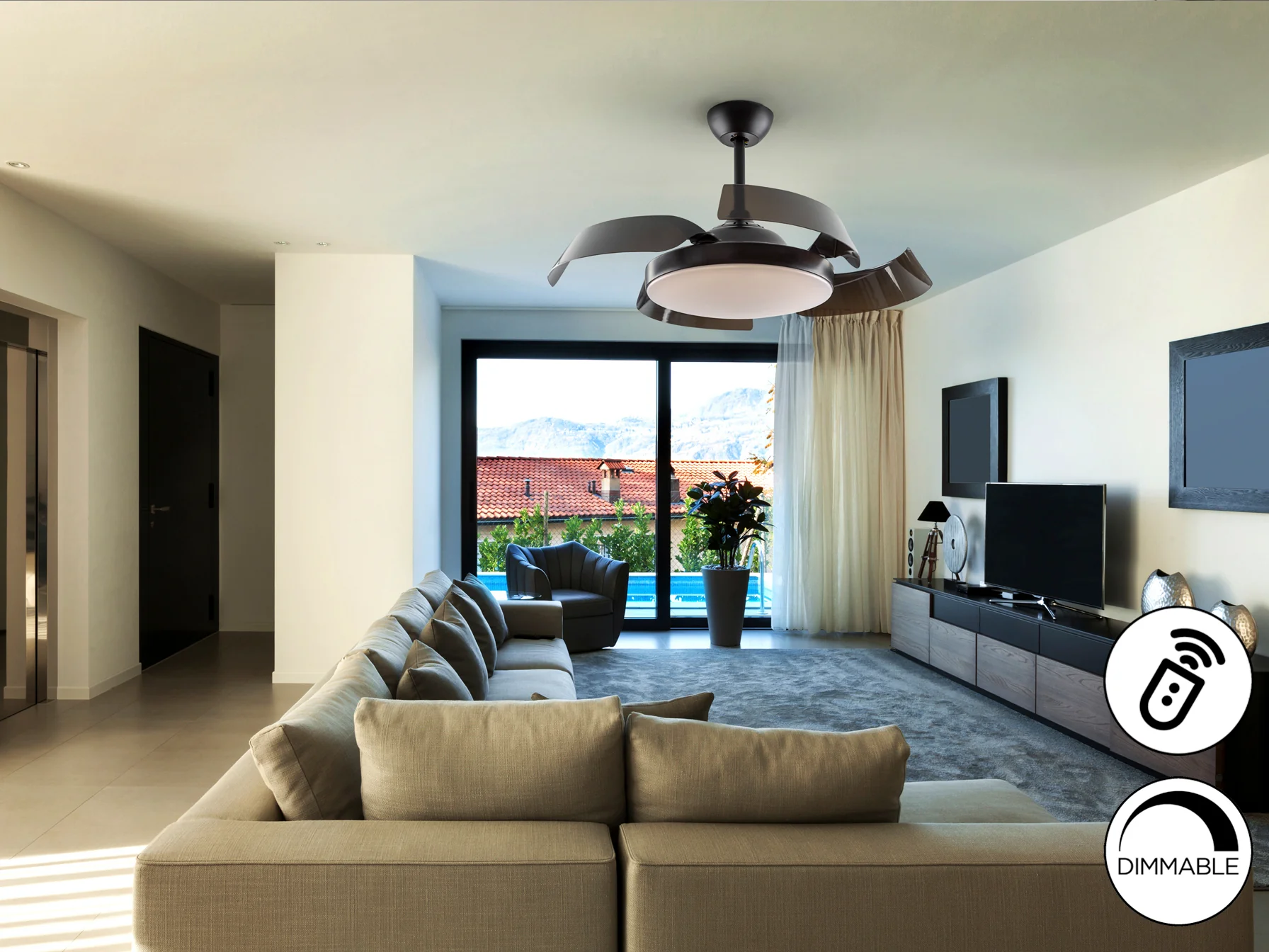 El Enzo Negro Dim destaca por su motor DC silencioso de 6 velocidades, que garantiza una ventilación eficiente y adaptable a cada momento del día. Sus aspas retráctiles de acrílico negro brillo se integran perfectamente en el diseño cuando no están en uso, transformándose en una elegante lámpara de techo. El difusor acrílico opal proporciona una luz suave y uniforme, creando un ambiente acogedor.