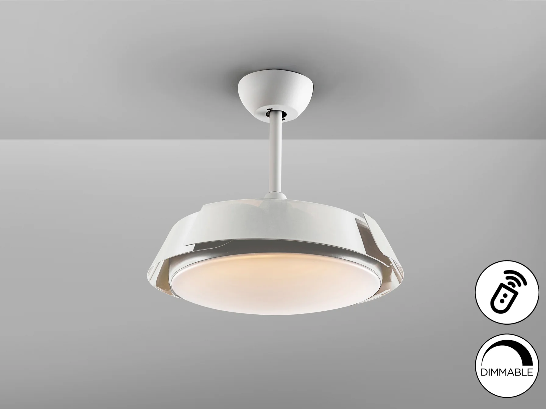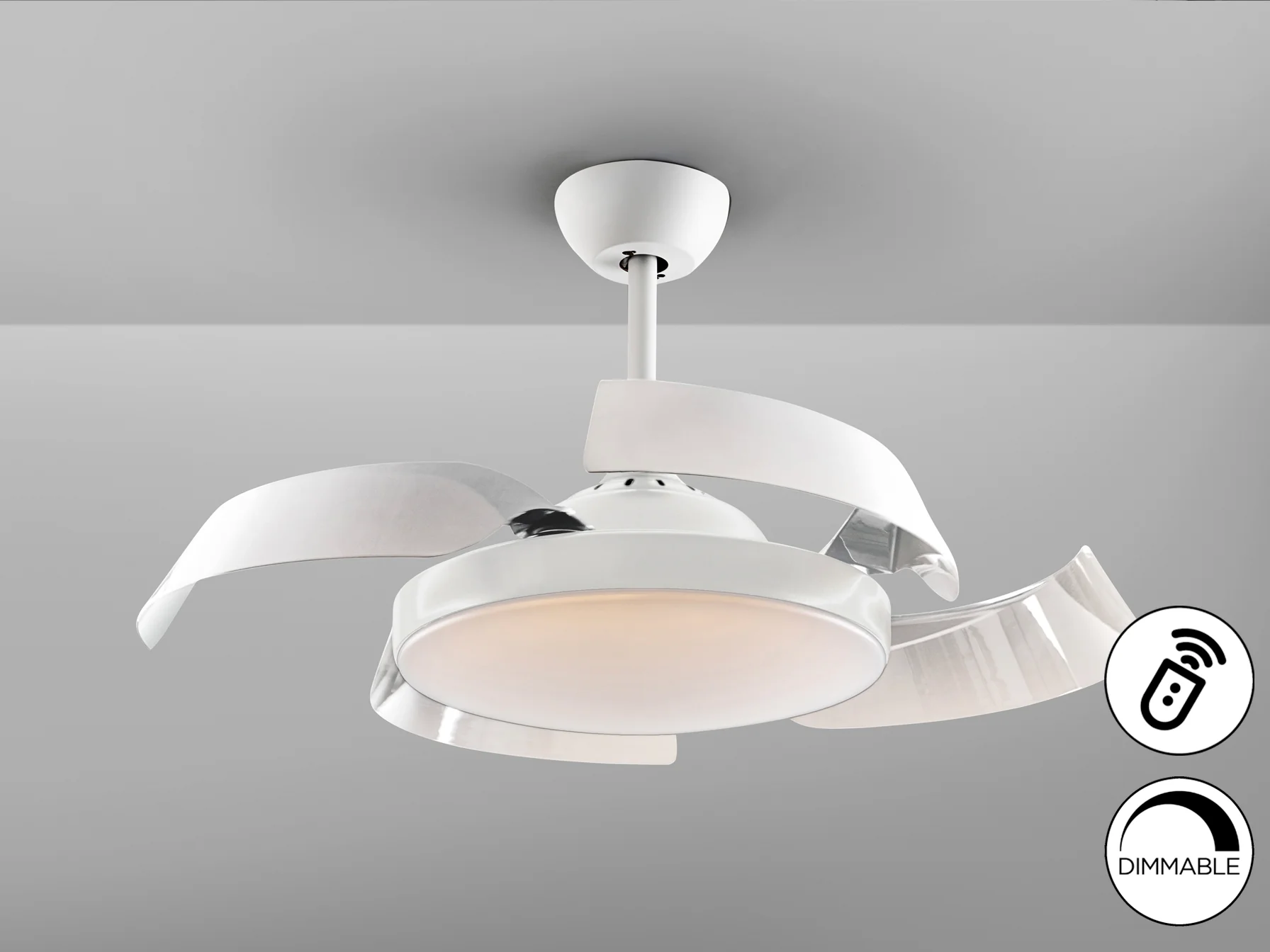 El Enzo Blanco Dim combina la funcionalidad de un ventilador de techo con la estética de una lámpara moderna. Fabricado con materiales de alta calidad como metal y acrílico, este ventilador ofrece durabilidad y un diseño elegante. Sus aspas retráctiles se ocultan cuando no están en uso, transformándolo en una luminaria discreta. El motor DC proporciona un rendimiento eficiente y silencioso, mientras que la luz LED dimable te permite ajustar la intensidad y el tono de la luz según tus preferencias.