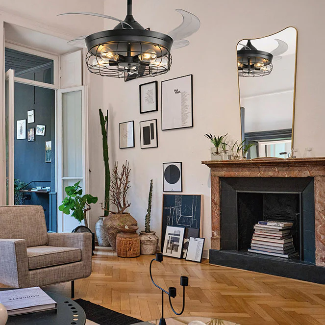 Ventilador DC ANTICUARIO negro, 4 aspas retráctiles, 5 bombillas LED 4W E27 2700K, Al.42xD.107/53cm