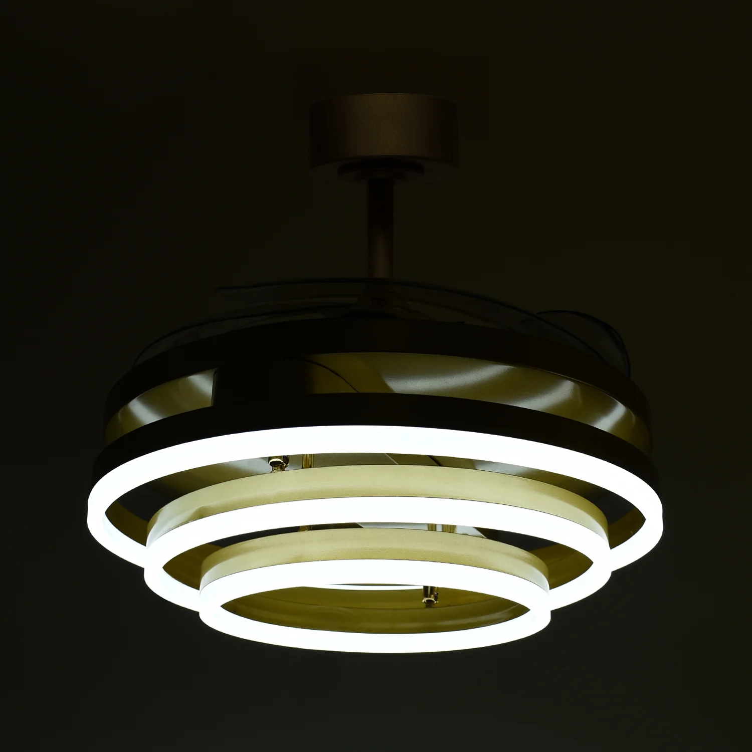 Ventilador DC SFERA oro, 4 aspas retráctiles, 72W LED 3000|4000|6000K, Al.45xD.108/50cm