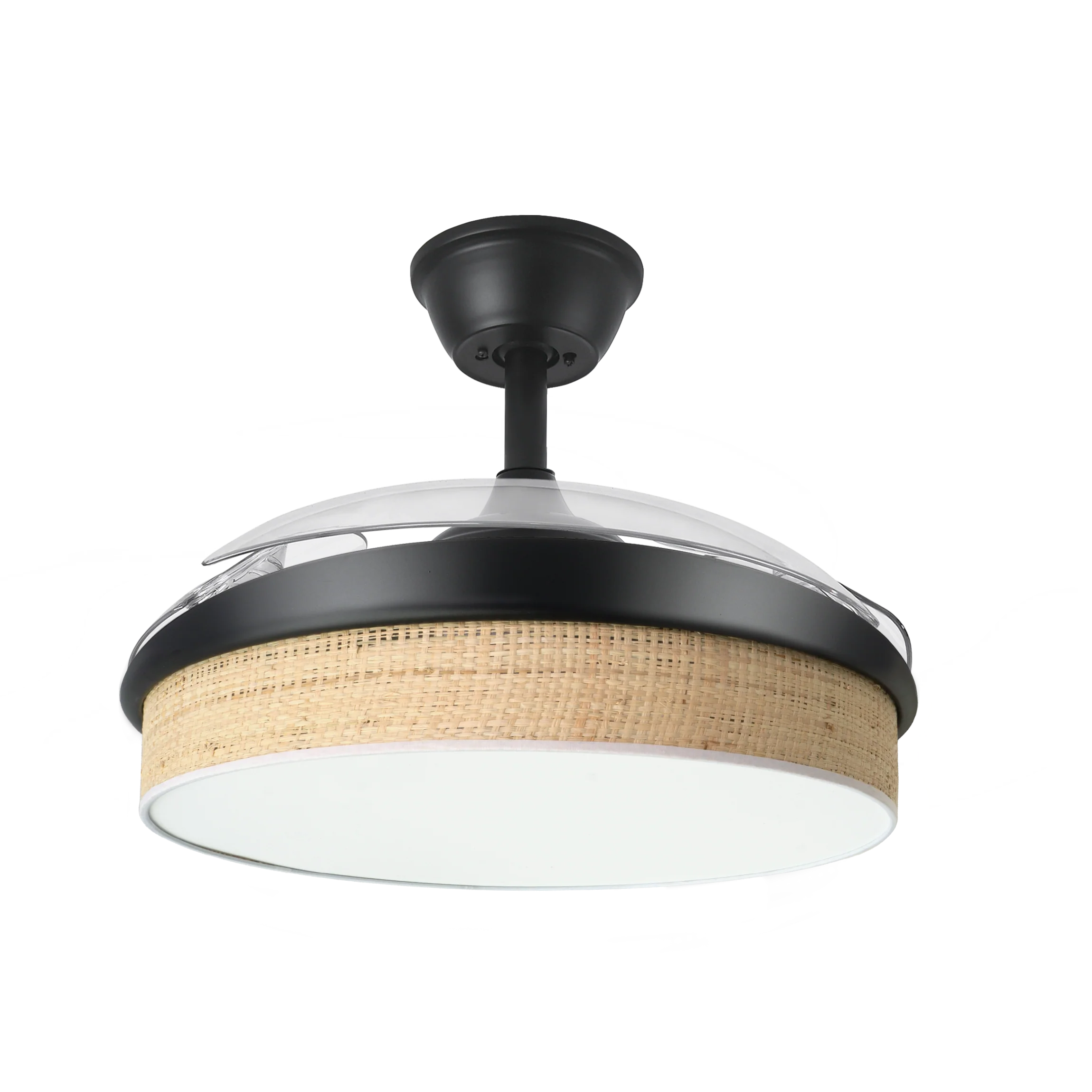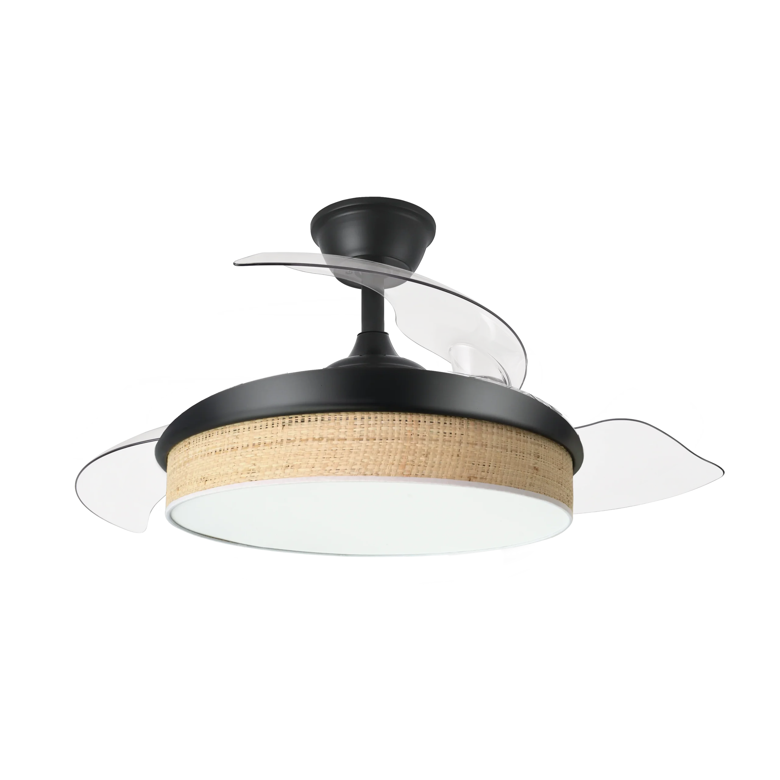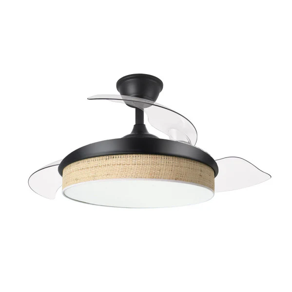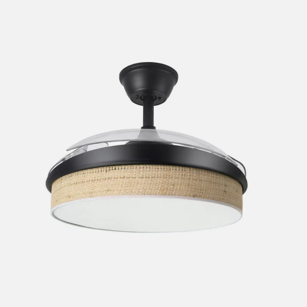 - Aspas Retráctiles de 3 Palas: Diámetro de 91 cm desplegado y 40 cm plegado, ahorra espacio y añade un toque decorativo moderno con diseño en negro y cañizo claro.