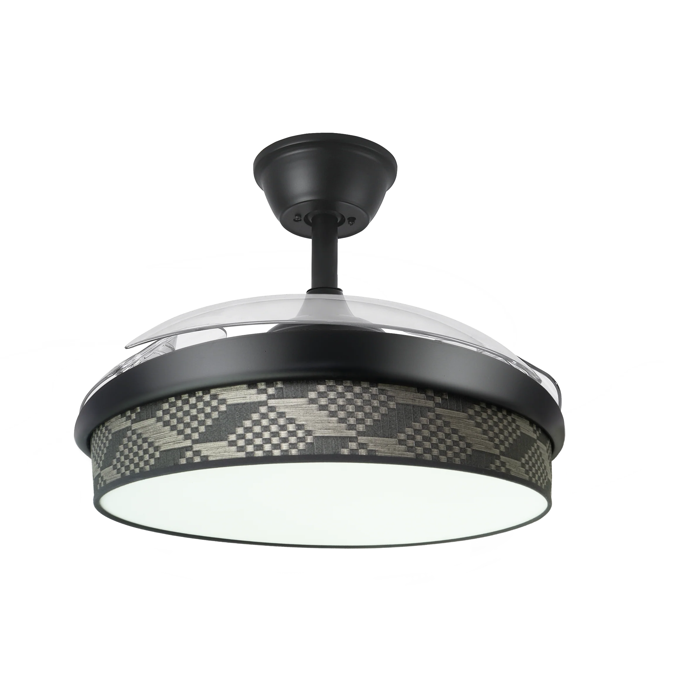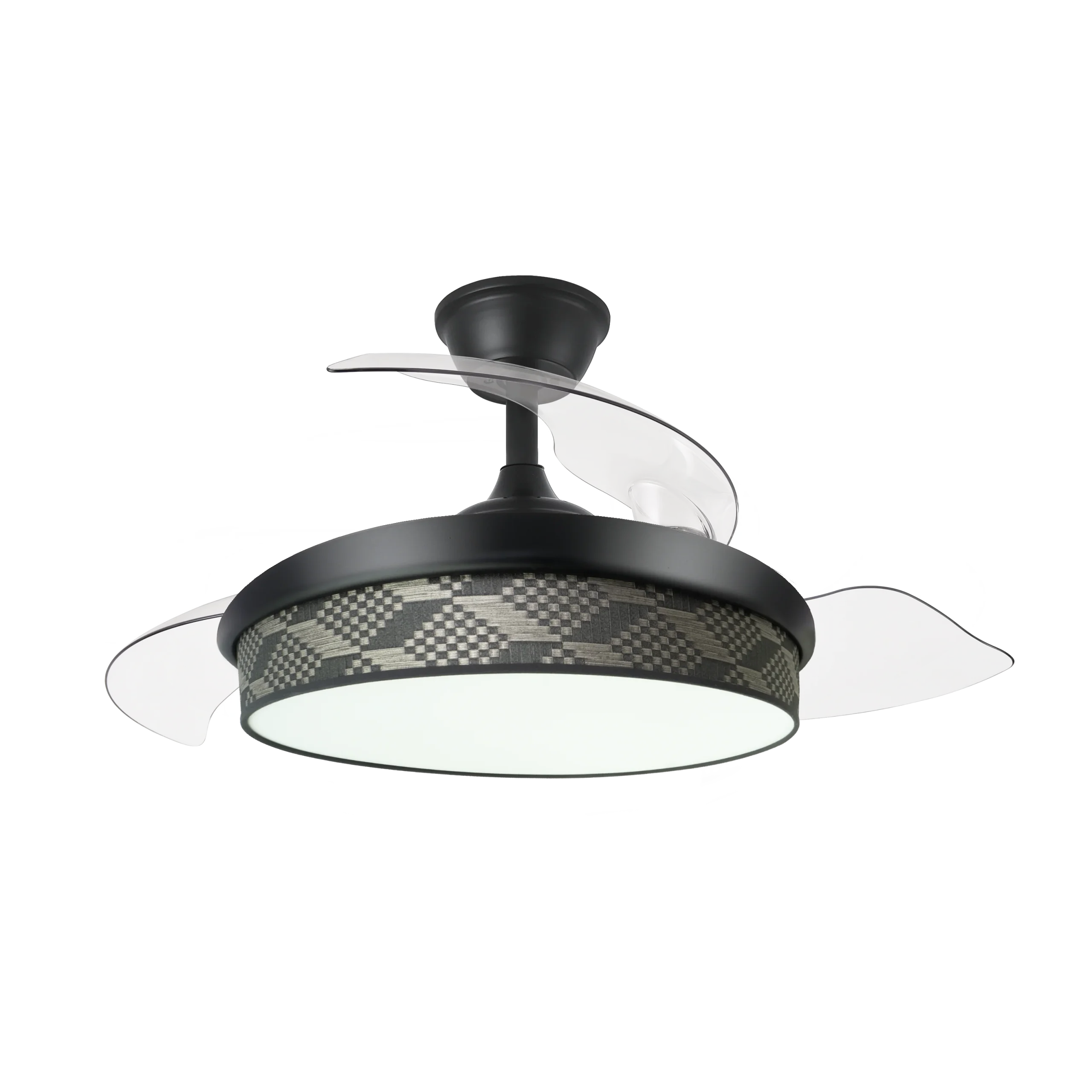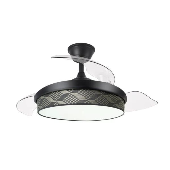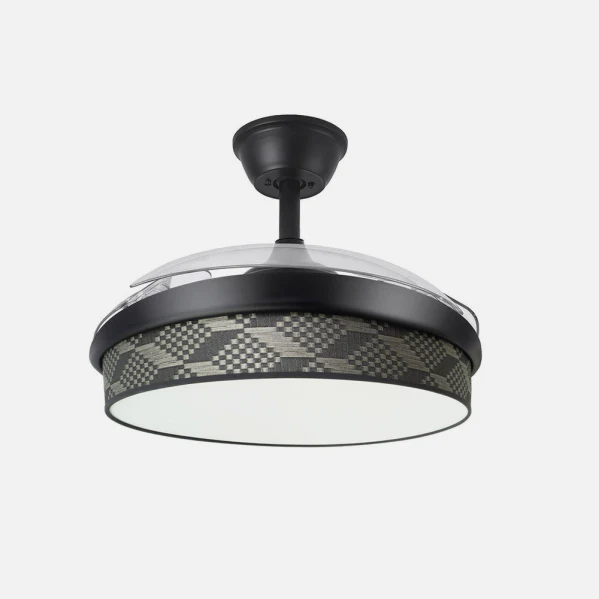- Aspas Retráctiles de ABS: Diámetro desplegado de 91 cm para brisa potente, plegadas a 40 cm como lámpara decorativa, con control verano/invierno para circulación de aire reversible y diseño moderno en negro/tetris gris.